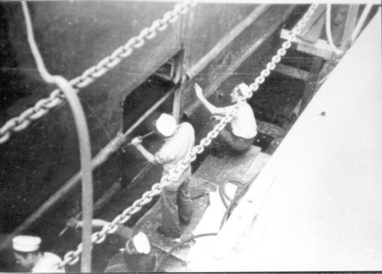 61k | USS LSM-46 in dry dock. Her starboard side being repaired after being hit by friendly fire from a disabled and abandoned tank. Part of the detonator was found in a mattress in the forward crew compartment | Charles J. Sturm, USS LSM-46 Photo Courtesy Jim Tusing USS LSM-372, Editor "Alligator Alley" The Newsletter of the USS LSM - LSMR Association |