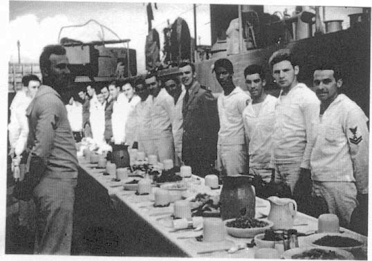 47k | USS LSM-46 crew preparing to sit down to Christmas dinner, December 1944. | Richard Miller BMCS USNR Ret. for his father Lawrence A. Miller QM2/c USS LSM-46 | |