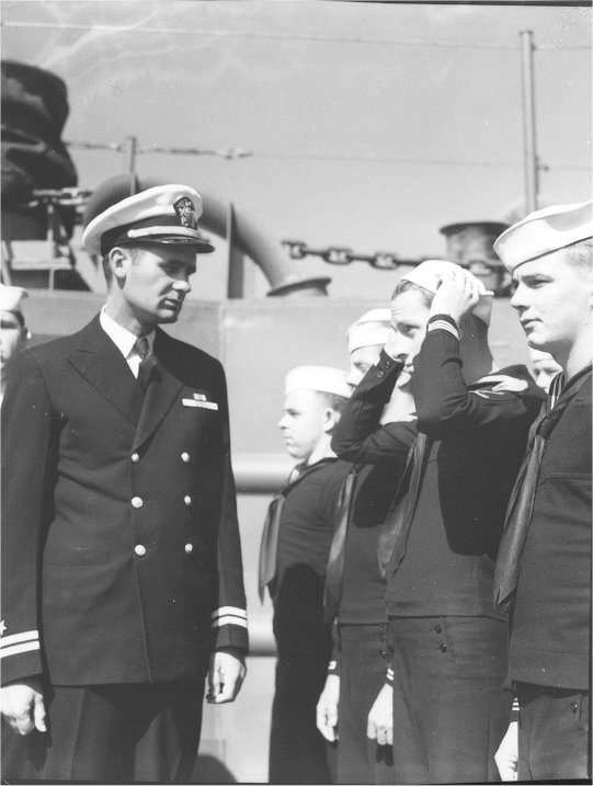88k | USS LSM-46 Commanding Officer, LT. Edwards, inspects his crew during Captain's Inspection, date and location unknown. | Richard Miller BMCS USNR Ret. for his father Lawrence A. Miller QM2/c USS LSM-46 | |