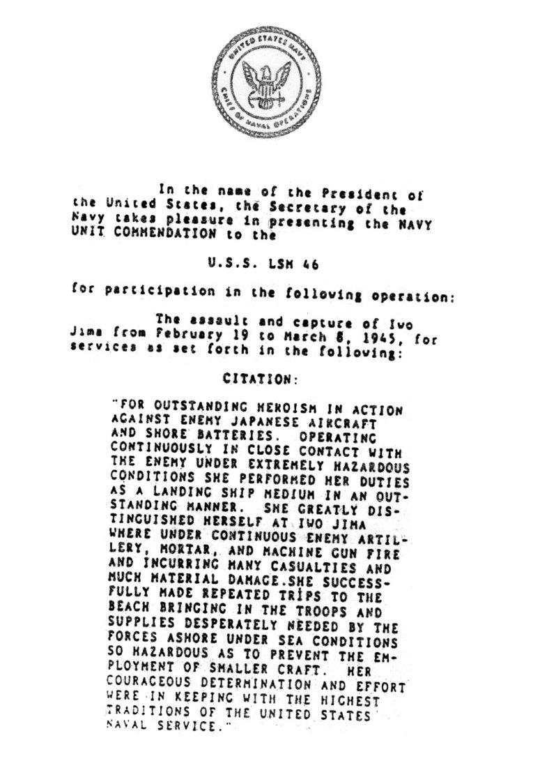 37k | USS LSM-46 crew receiving pre-invasion briefing prior to landing at Iwo Jima. | Richard Miller BMCS USNR Ret. for his father Lawrence A. Miller QM2/c USS LSM-46 | |