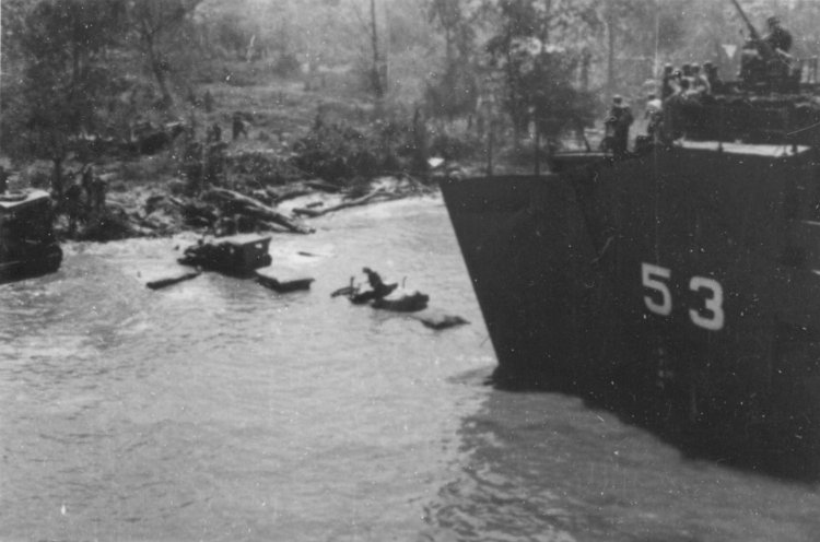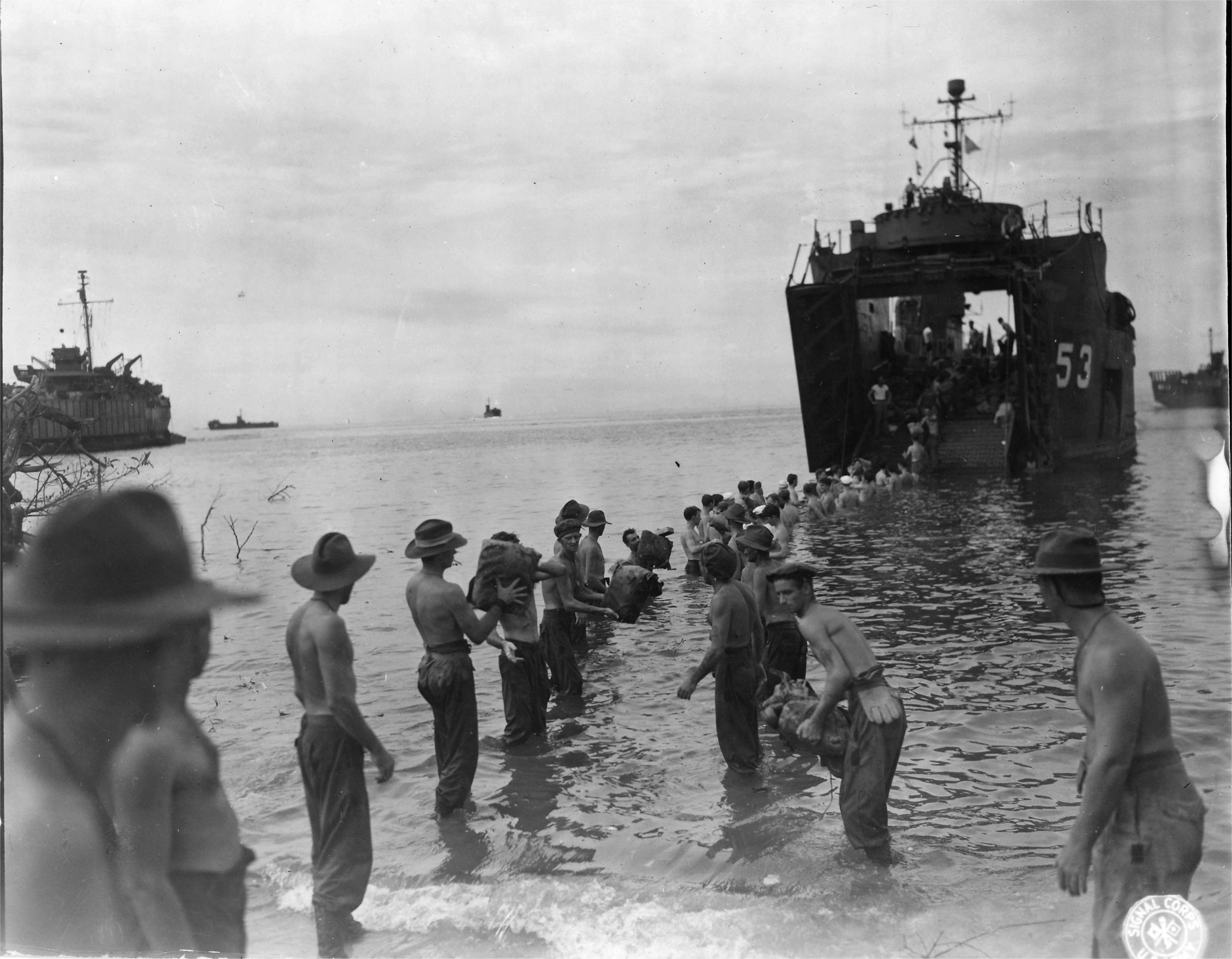 575k | Australian Army 214 Pioneer Battalion soldiers, with the help of US Navy sailors, unload USS LSM-53 on the beach at Labaun Island, 11 June 1945. US Army Signal Corps. photo # SC 209754 by Heller, from the collections of the US National Archives. |