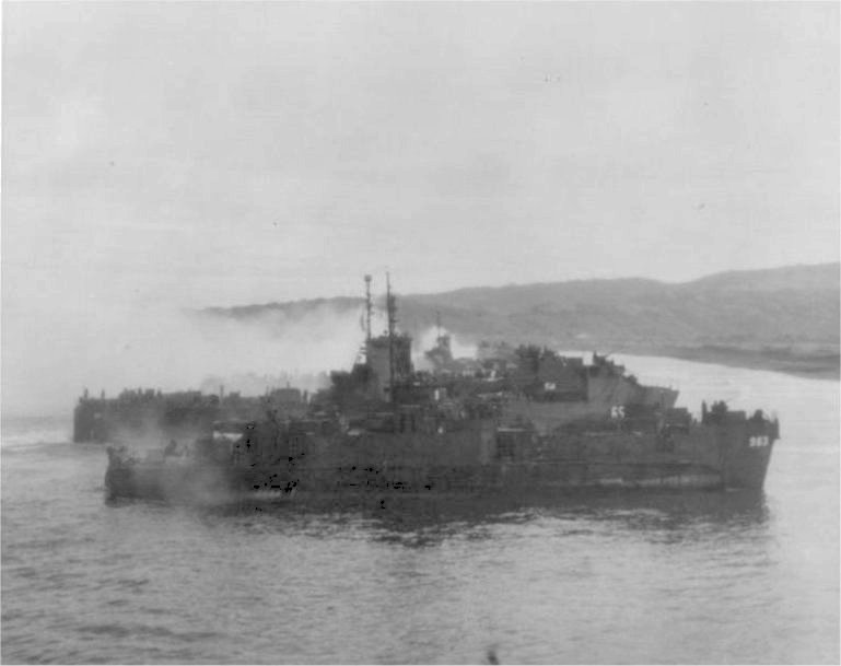 38k | USS LSM-65, USS LSM-54 and USS LCI(L)-963 preparing to beach at Nasugbu, Luzon, P.I., 31 January 1945. US National Archives photo # 80-G-K-3153 a US Navy photo now in the collections of the US National Archives. |