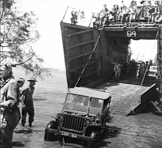 60k | Members of 1 Beach Group are unloading a Jeep from USS LSM-64 at Labaun Island Brown Beach 2 on June 10, 1945. The landing here
