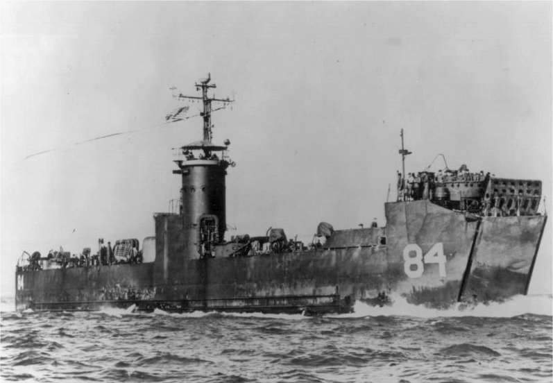 95k | USS LSM-84 beached at Okinawa while unloading mail and supplies. Note: that LCT-1381's stern is also visible in this photo. | USS LSM / LSMR Association | |