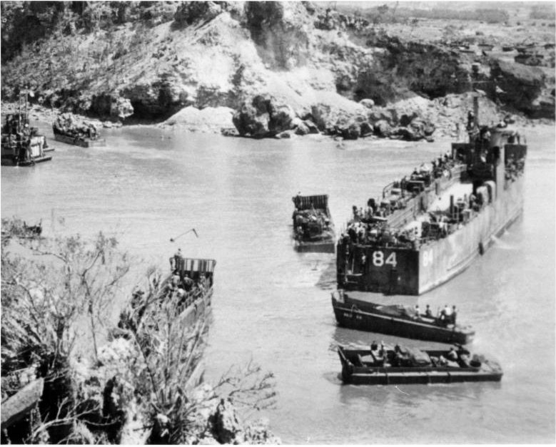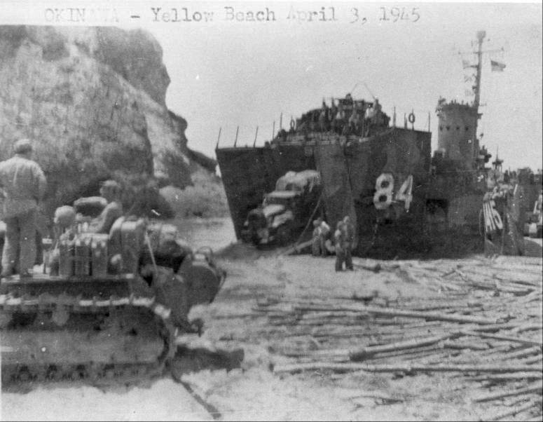 66k | USS LSM-84 unloading an armored tracked vehicle on the beach at Okinawa alongside USS LST-71and an unidentified LST, date unknown. | USS LSM / LSMR Association | |