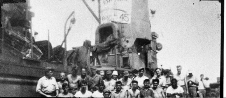 52k | LSM-107 crew photo, date and location unknown. Note the sign on the conning tower. | Dana Vickery to the USS LSM / LSMR Association | |