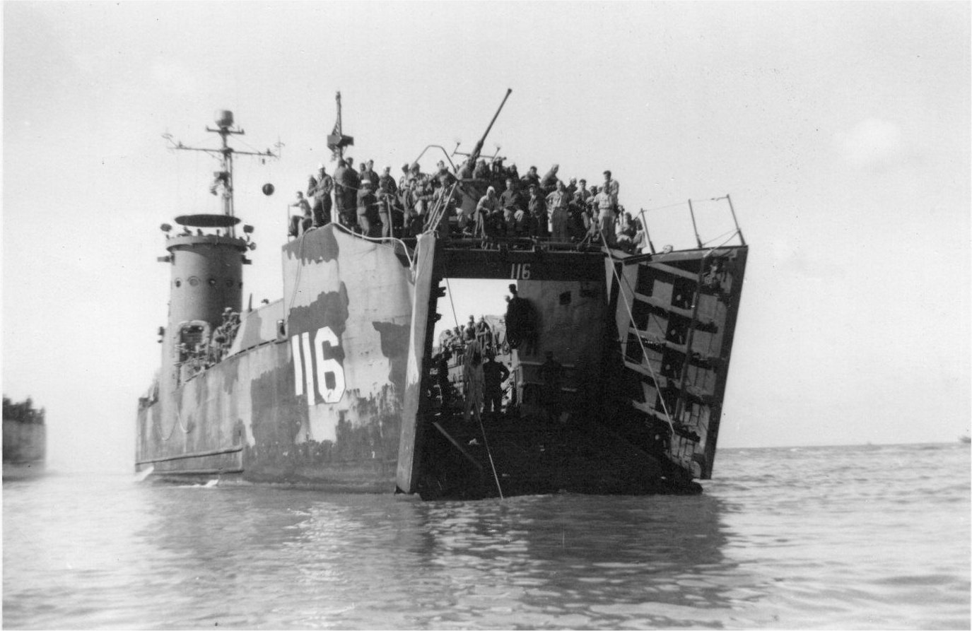 48k | USS LSM-116, beached, in the Philippines preparing to depart for Okinawa in 1945. | Photo by H. E. Freeman PhM/1c, LSM-116 now in the collection of Robert C. Lozmack, BM/2c, LSM-116 and LSM-467 |