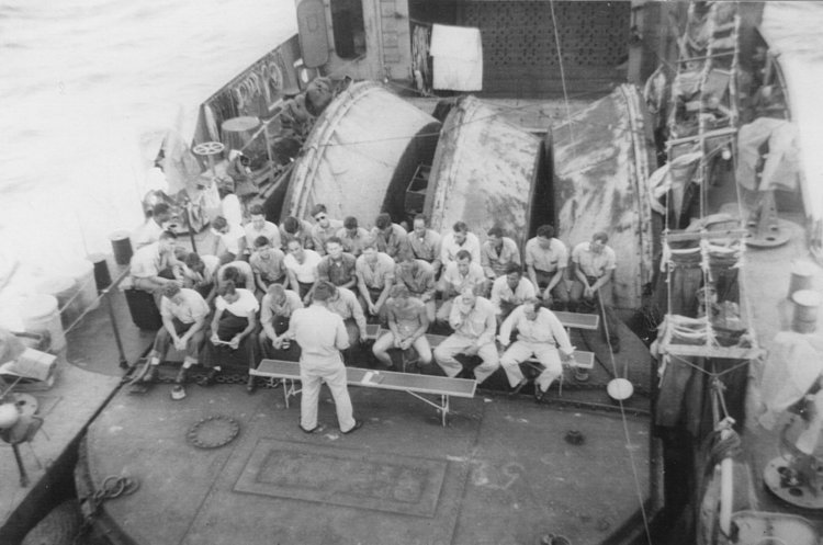 70k | Church services aboard USS LSM-116 on the way to Guam. She is loaded with rescue flotation tanks used in raising sunken ships, date unknown. | Photo by H. E. Freeman PhM/1c, LSM-116 now in the collection of Robert C. Lozmack, BM/2c, LSM-116 and LSM-467 |