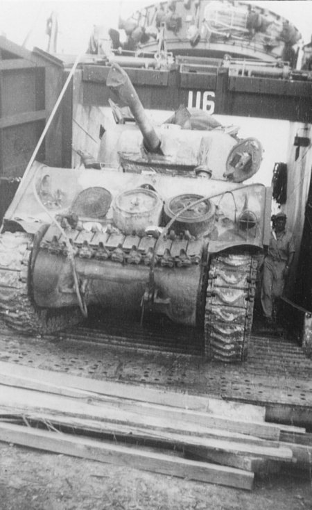 66k | A 2nd Marine Division tank exits USS LSM-116 at Saipan after the invasion of Okinawa. | Photo by H. E. Freeman PhM/1c, LSM-116 now in the collection of Robert C. Lozmack, BM/2c, LSM-116 and LSM-467 |