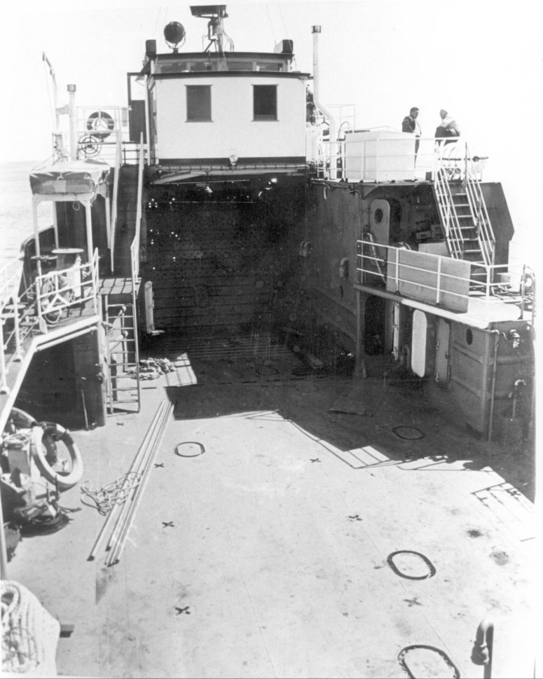 117k | Alaska Roughneck, looking forward on the converted tank deck. Note: the bridge is now forward and located on what was originally the forward gun deck, date and location unknown. | USS LSM / LSMR Association | |