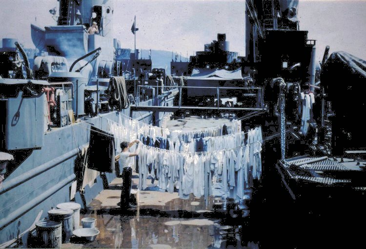 88k | USS LSM-117 moored to USS LSM-467's, port side at Tulosa, Leyte, P.I. John S. Moore, S/2c, doing laundry, 11 December 1945. | Richard W. Friedrich, F/1c, LSM-467, Collection, slide number 040 | |