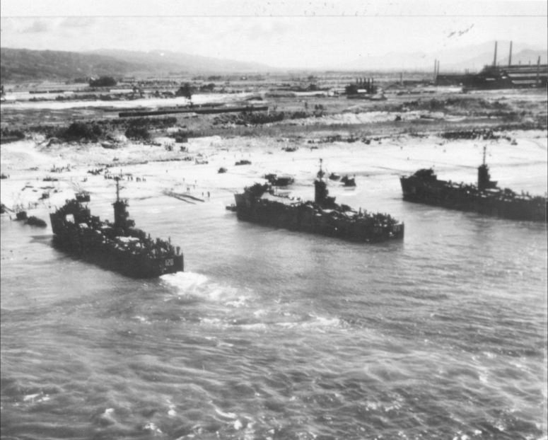 77k | USS LSM-120, USS LSM-123 and USS LSM-338 landing Army occupation forces at Wakayama, Japan, 23 September 1945. US Navy photo # NH 351357 from the collections of the US Naval Historical Center |