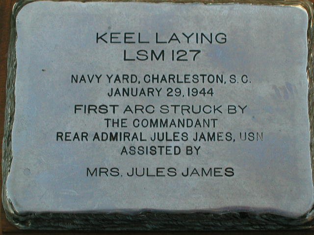 61k | LSM-127 keel laying plaque, 29 January 1944, Charleston Navy Yard, Charleston, S.C. | James family via Robert Hall | |