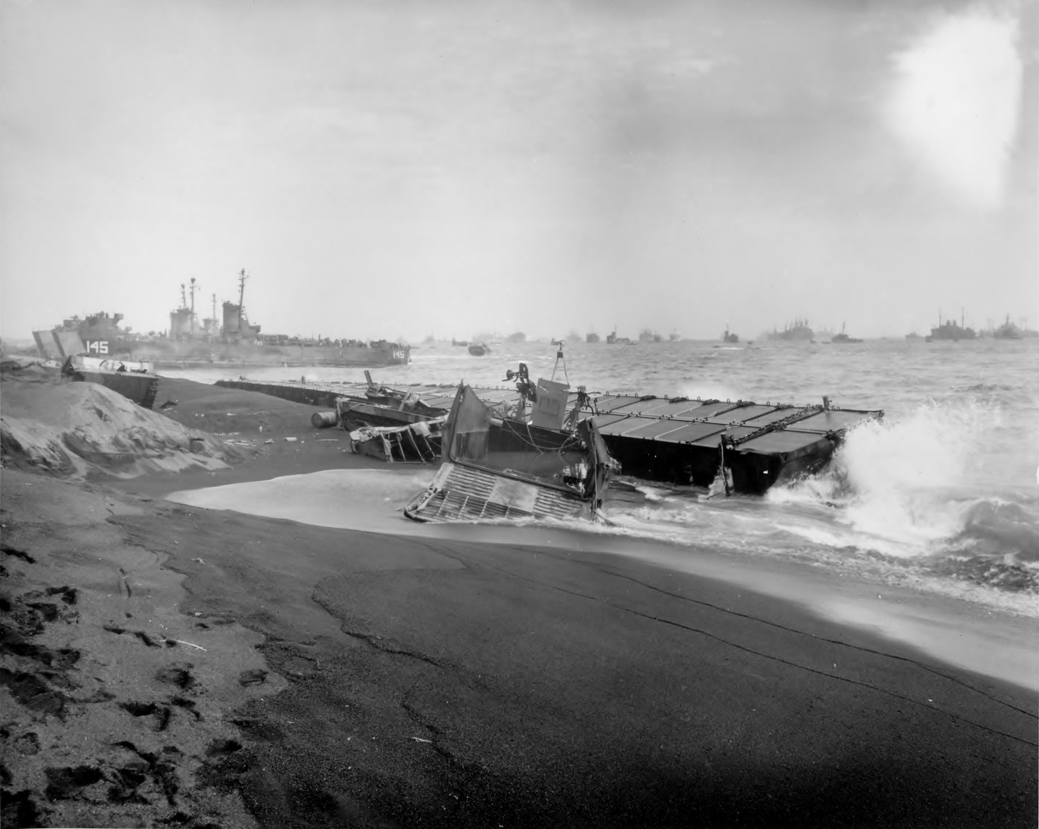 197k | USS LSM-145 beached on Red Beach 1, Iwo Jima, D plus 11, 2 March 1945.