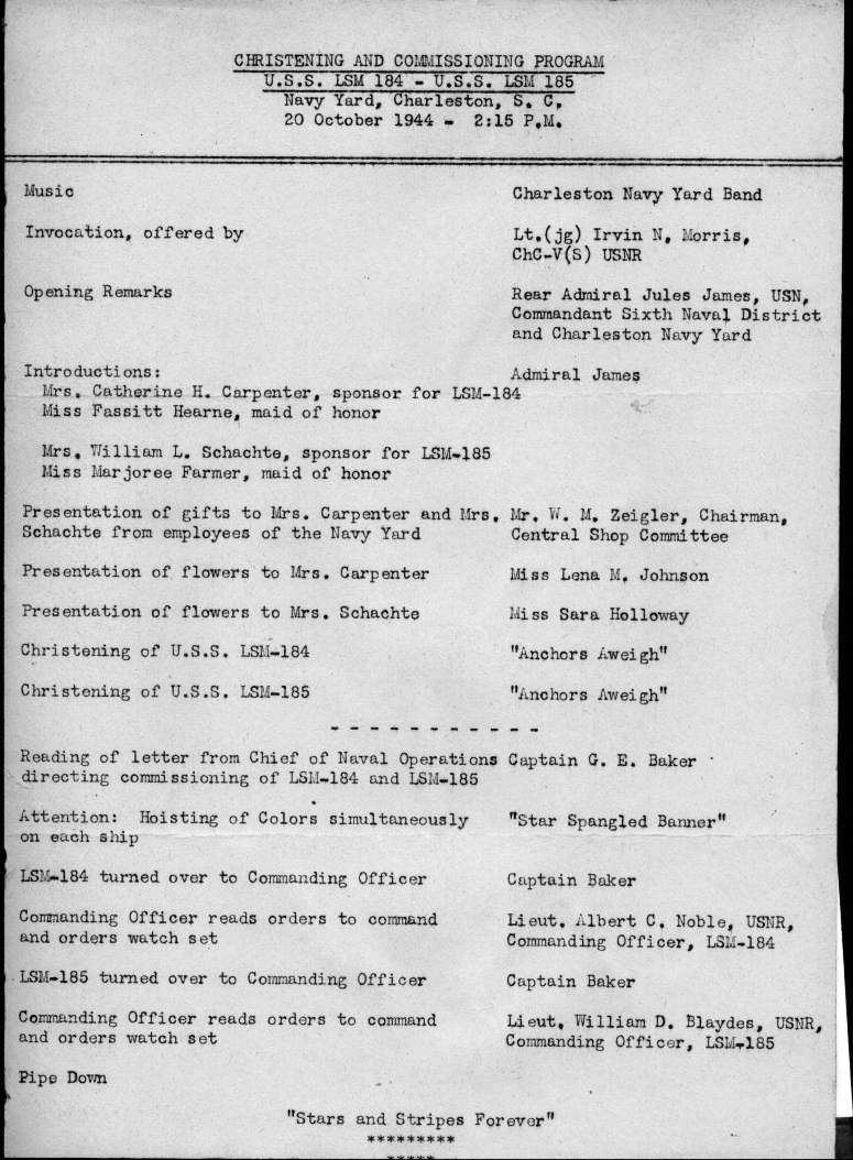 165k | USS LSM-184 and USS LSM-185 Christening and Commissioning Program. | LT Albert C. Noble USNR, CO LSM-184 to the USS LSM / LSMR Association | |