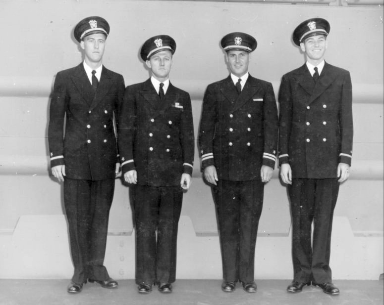 56k | USS LSM-184 officers at Christening and Commissioning, 20 October 1944, Charleston Navy Yard, Charleston, S.C. From left to right: Ens. Richard Daubenspeck USNR, Engineering Officer; Ens. F. Dale Meeder USNR, Executive Officer; LT. Albert C. Noble USNR, Commanding Officer; Ens. Donald Young USNR, Gunnery and Communications Officer. | LT Albert C. Noble USNR, CO LSM-184 to the USS LSM / LSMR Association | |