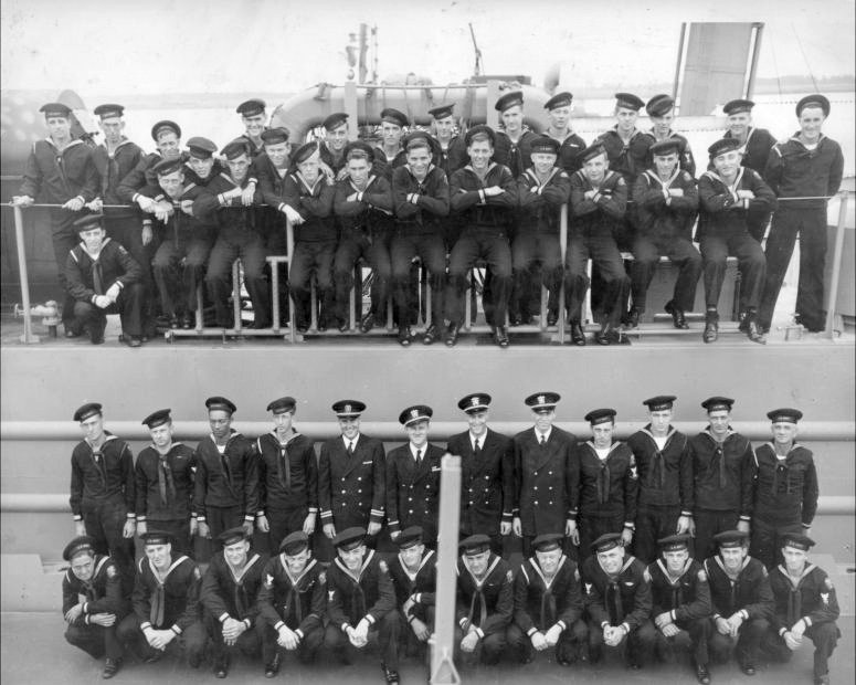 93k | USS LSM-184 enlisted crew at Christening and Commissioning, 20 October 1944, Charleston Navy Yard, Charleston, S.C. From left to right, Front Row: Angers, Roberts, Pretchell, Stahusky, Retmanski, Dawdy, Hammond, Stephenson, McKiernan, Eaton, Van Camp, Saloat; Second Row, Lust, Nhare, Johns, Bachlor, Noble, Meeder, Daubenspeck, Young, Webster, Compton, Parrill, Jeffrey. Names not supplied for top two rows. | LT Albert C. Noble USNR, CO LSM-184 to the USS LSM / LSMR Association | |