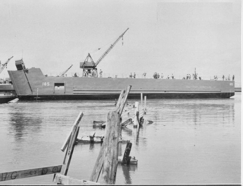 LSM-185 after launching at Charleston Navy Yard, 7 September 1944. US Navy Yard Charleston photo. |