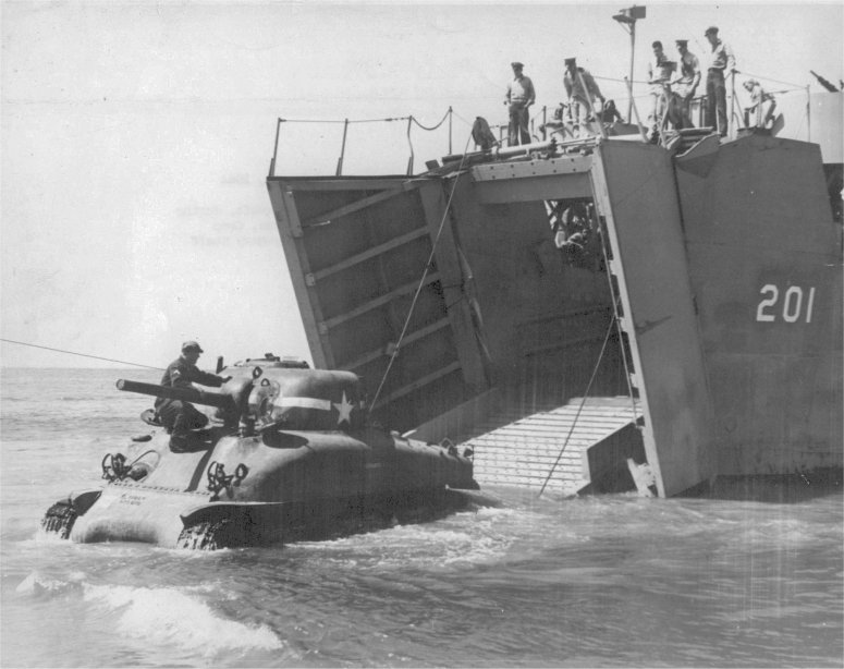74k | USS LSM-201 beached while off loading a medium tank across the beach at ATB Camp Bradford, VA., 11 May 1944. US Navy photo |