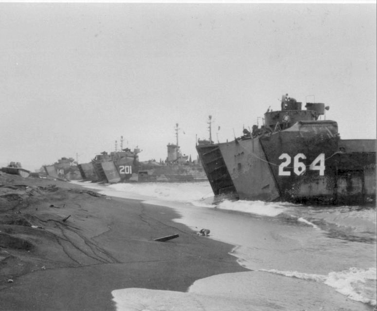 142k | Marines unload supplies from USS LSM-201 and USS LST-807, and other amphibious warships beached at Iwo Jima on D-Day, 15 February 1945. US National Archives photo # NWDNS-26-G-4098. |