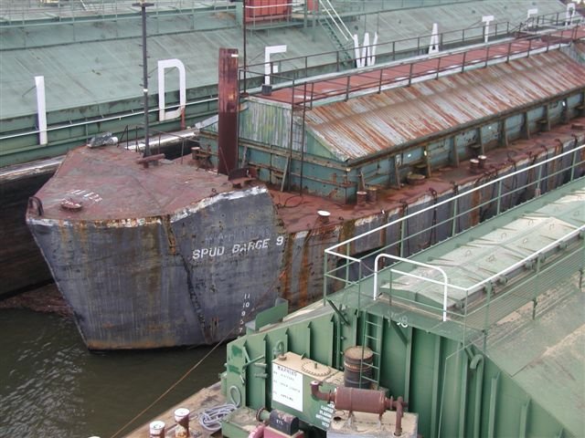 70k | Ex-LSM-209, Tidewater Barge Line tie-off barge Spud Barge 9 anchor recess., March 2003 Photo, March 2003 |
