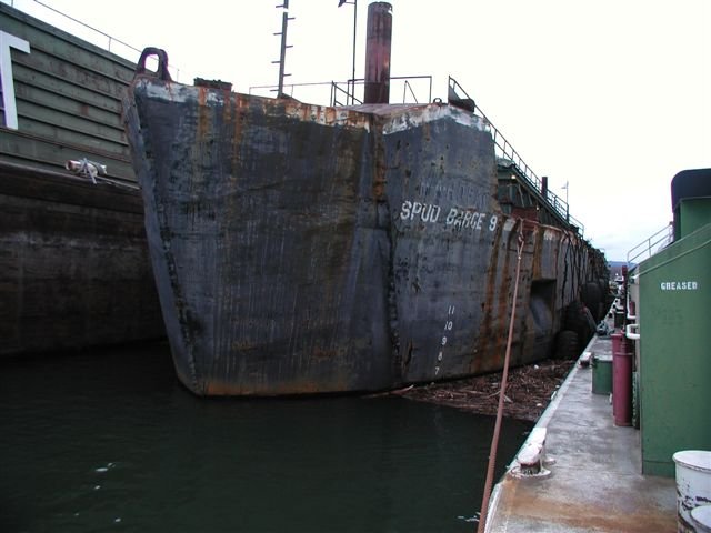 76k | Ex-USS LSM-209, ex-barge Mahopac, in use as a tie-off barge Spud Barge 9 for the Tidewater Barge Line, on the Columbia River. Photo, February 2003 |