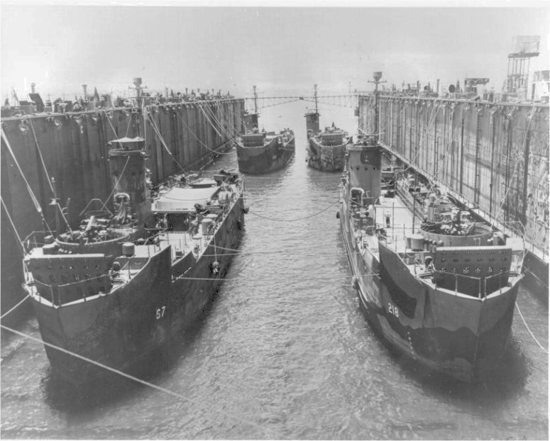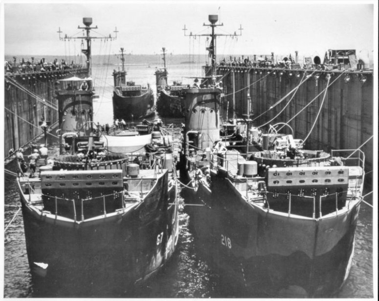 97k | USS ABSD-1 at Espiritu Santo, New Hebrides, with, front, left to right USS LSM-67 and