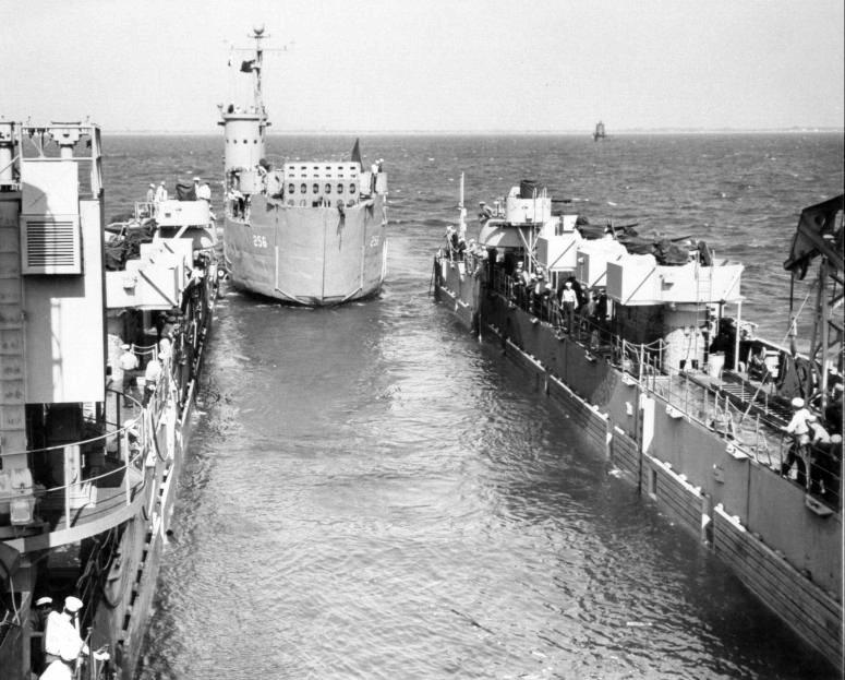 USS LSM-256 at the bottom of the photo. Other ships that are identified and marked are