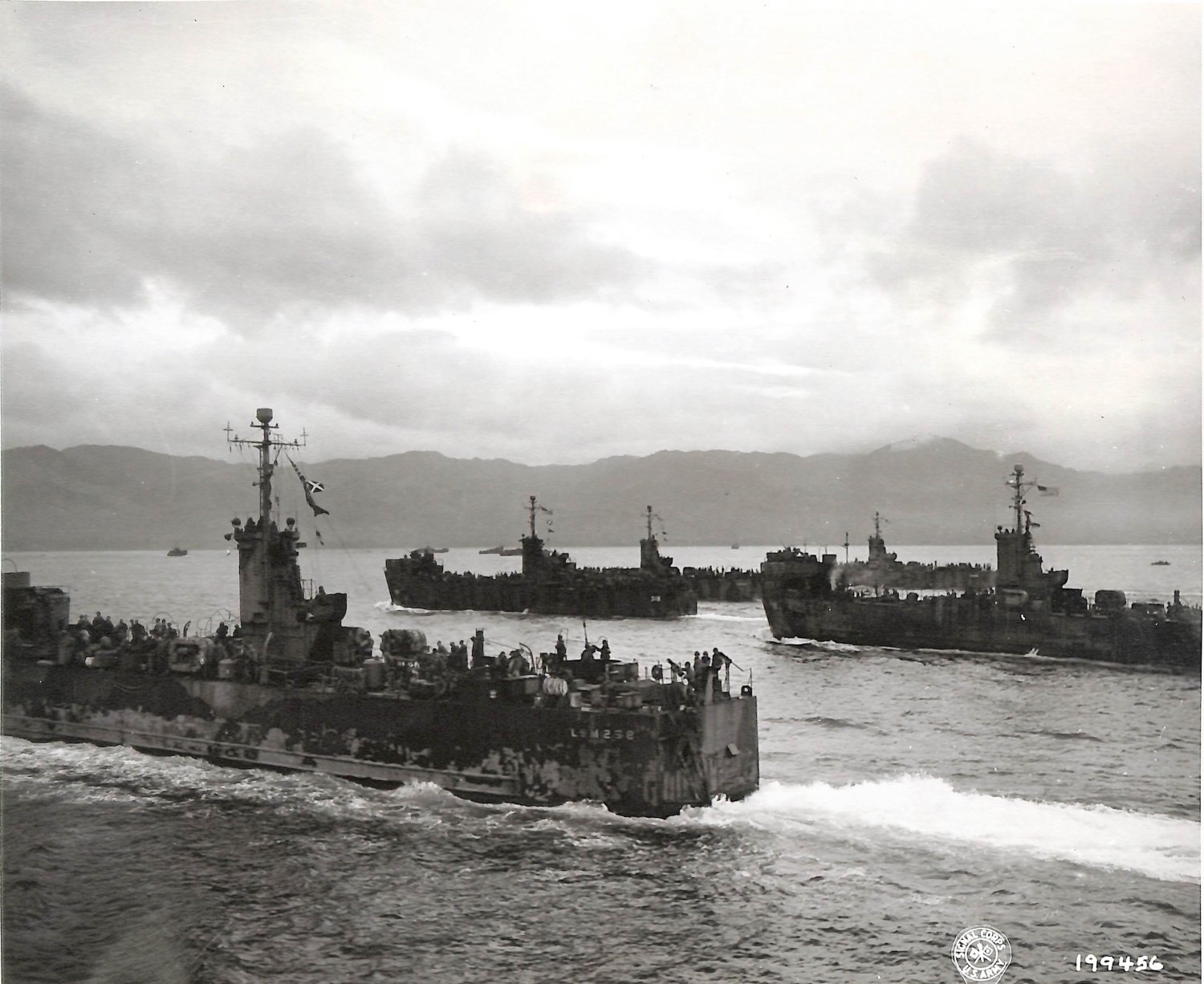 101425814 | 244k | LSMs including USS LSM-258 and USS LSM-318 carrying the 2nd wave of the US Army 77th Division moving into a beach near Ormoc, Leyte Island, Philippine Islands,