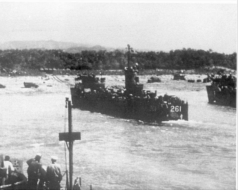 92k | LSM-261 approaching a beach during landing exercises, date and place unknown. | Marty Petersen to the USS LSM / LSMR Association | |
