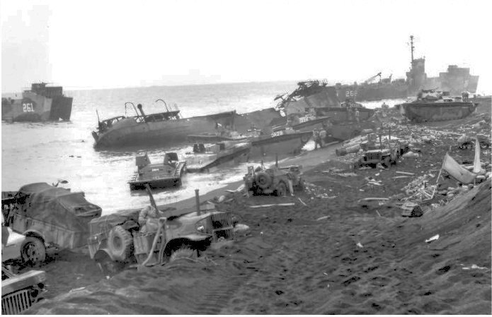 57k | USS LSM-266 and LSM-261 beached at Iwo Jima, 15 February 1945. | James Tusing | |