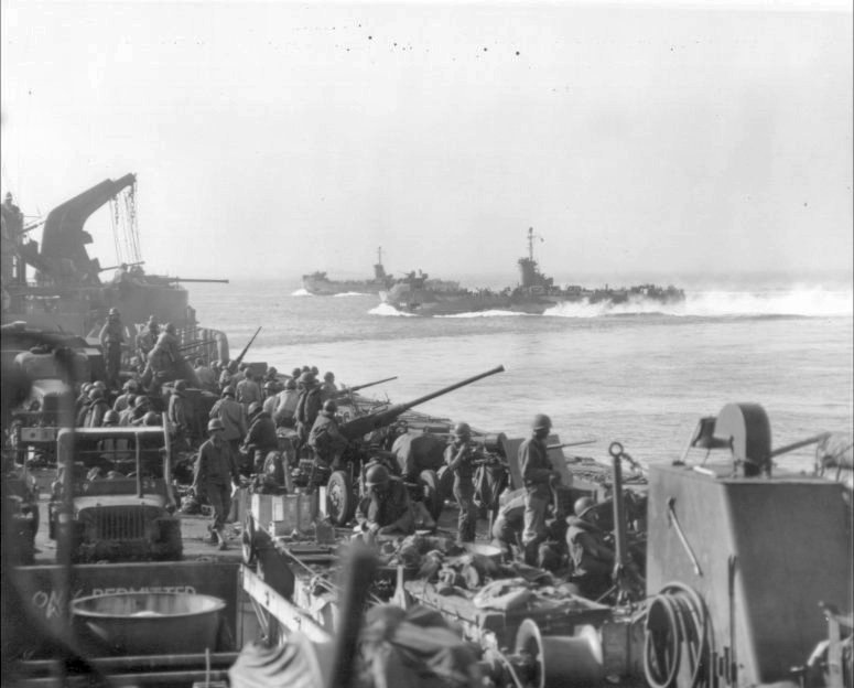 61k | USS LSM-268 heading for the beach at Lingayen Gulf in February 1945. US Navy photo # NH 200499 from the collections of the US Naval Historical Center. |