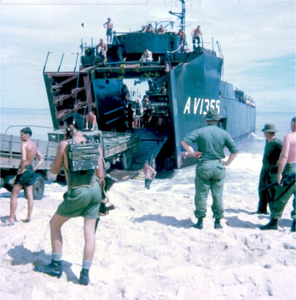 Australians based at Vung Tau. Note that the bow doors are open, as the ramp is still being raised. Australian War Memorial, Photo No. P02679.001 |