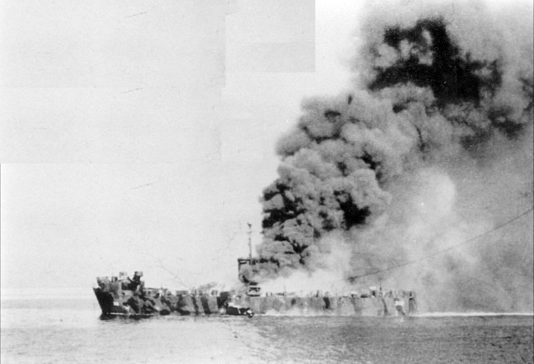 USS LSM-318 on fire and sinking at Ormoc Bay, Philippine Islands, 7 December 1944, after being struck by a Japanese Kamikaze Plane. |
