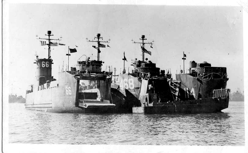 USS LSM-66, USS LSM-468, and USS LSM-114, nested together at Terminal Island CA. Note LSM-66 is missing her bow doors which were lost in a storm. (Courtesy of Harlan Criss). |