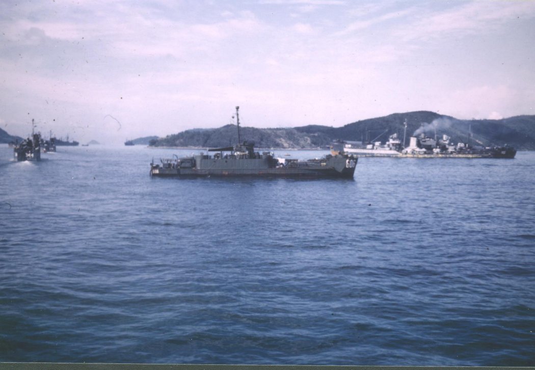 107k | USS LCI-606 at Sasebo, Japan, USS LSM-344 and possibly USS LSM-476 left background, leaving port. An unidentified destroyer and tender can be seen in the right background, 24 September 1945. | Richard W. Friedrich, F/1c, LSM-467, Collection, slide number 023 | |
