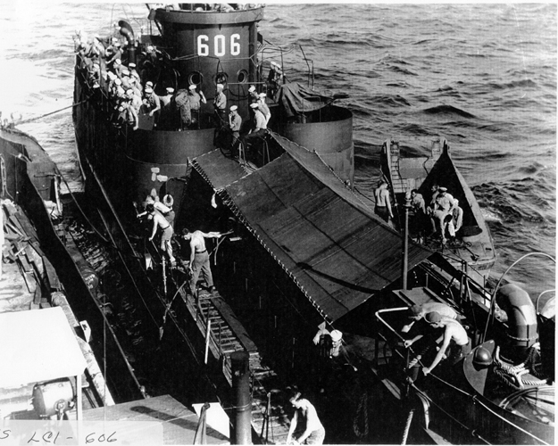 228k | USS LCI-606 tying up alongside an LCT, date and location unknown. Photo from US Navy Memorial |