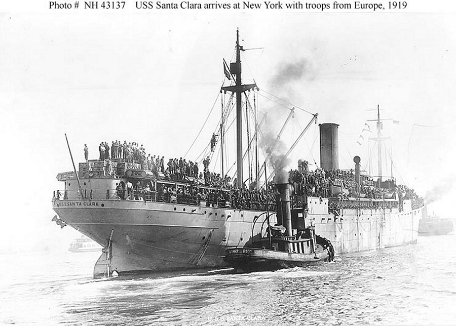 Assigned to Naval Overseas Transportation Service (NOTS), Santa Clara arrived at Marseilles on 15 November 1918, four days after the armistice was signed, bringing 6,655 tons of general cargo. After returning to Baltimore on 24 December 1918, Santa Clara was transferred, on 18 January 1919, to the Cruiser and Transport Force, Atlantic Fleet.