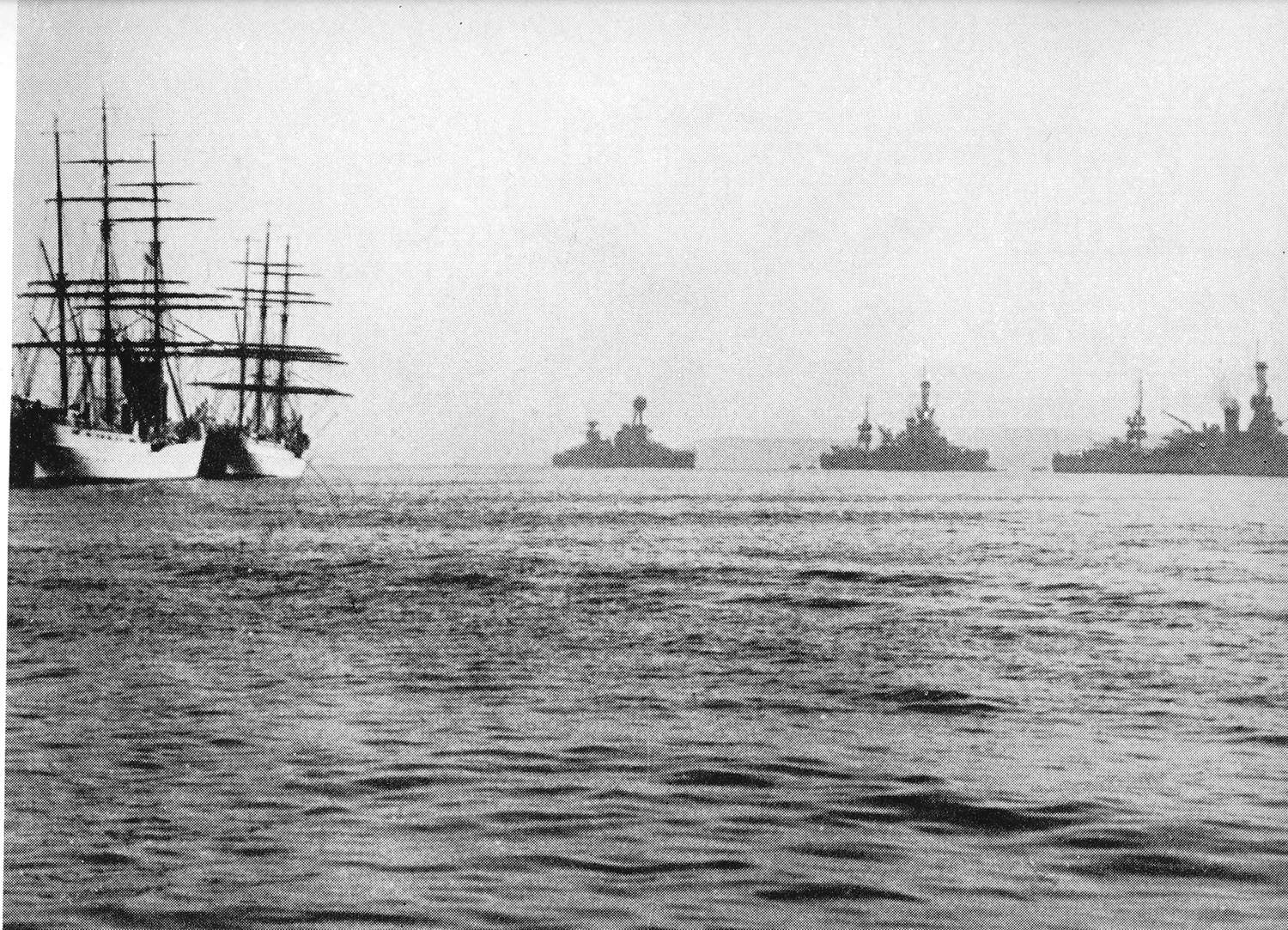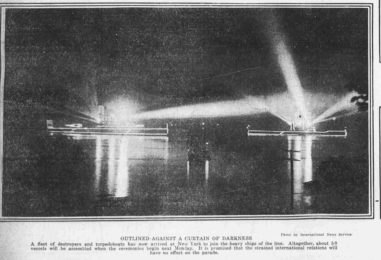 Sunday sightseers going on board the super-dreadnought New York (BB-34). Looking up the river from the aft deck of the New York, three of the big fighters of the fleet, the Texas (BB-35), Delaware (BB-28) and the North Dakota (BB-29), can be seen. Image and text provided by The New York Public Library, Astor, Lenox and Tilden Foundation. | Photo by The Sun. (New York [N.Y.]) 1833-1916, 10 May 1915, Image 14, courtesy of chroniclingamerica.loc.gov. ![]() 250k | OUTLINED AGAINST A CURTAIN OF DARKNESS | A fleet of destroyers and torpedo-boats has now arrived at New York to join the heavy ships of the line. Altogether, about 50 vessels will be assembled when the ceremonies began next Monday. It is promised that the strained international relations will have no effect on the parade. Photo by International News Service. | Image and text provided by Penn State University Libraries; University Park, PA. Photo & text by Evening Public Ledger. (Philadelphia [Pa.]) 1914-1942, 13 May 1915, Night Extra, Image 16, courtesy of chroniclingamerica.loc.gov. ![]() 977k |