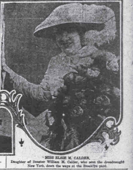 Launching of the New York (BB-34). Sponsor: Miss Elsie Calder, daughter of Representative William M. Calder, of New York, attended by Miss Kathleen Fitzgerald, daughter of Representative John J. Fitzgerald, of New York. BRILLIANT sunshine beat upon the towering red and gray hull and upon the fifty thousand eager spectators surging in the Navy Yard and filling every roof or vessel as far as the eye could reach. Flashing effects of sky and water helped to make vivid the bunting with which vessels and buildings were dressed. At half after ten o'clock a salute of 21 guns and the dipping of flags announced the arrival of President Taft, who proceeded through cheering crowds to the stand built about the bow of the mammoth ship. Beside him stood Miss Elsie Calder, carrying an armful of flowers and holding in her hand the silver-cased beribboned bottle of champagne. Little Miss Fitzgerald stood ready with an armful of flowers to pelt the ship. Grouped about them were Secretary of the Navy Meyer; Governor Dix and Staff; Rear-Admiral Hugo Osterhaus, Commander-in-Chief of the North Atlantic Fleet; Rear-Admiral Bradley A. Fiske, commanding the First Division; Captain Albert Gleaves, Commandant of the New York Navy Yard; Major-General Thomas H. Barry, Brigadier-General Tasker H. Bliss, and a brilliant assemblage of Army and Navy officers, and ladies. Among the ladies were Miss Helen Miller Gould and members of the Society of Sponsors of the U. S. Navy. At eleven o'clock the great ship began her flight to the river. A mighty cheer went up from the multitude; sirens on the warships Wyoming (BB-32), Arkansas (BB-33), Florida (BB-30) Utah (BB-31), Delaware (BB-28), Connecticut (BB-18) and on countless river craft screeched, and bands played unheard in the din. A luncheon was given in the sail loft to President Taft and a large number of invited guests immediately after the launching.