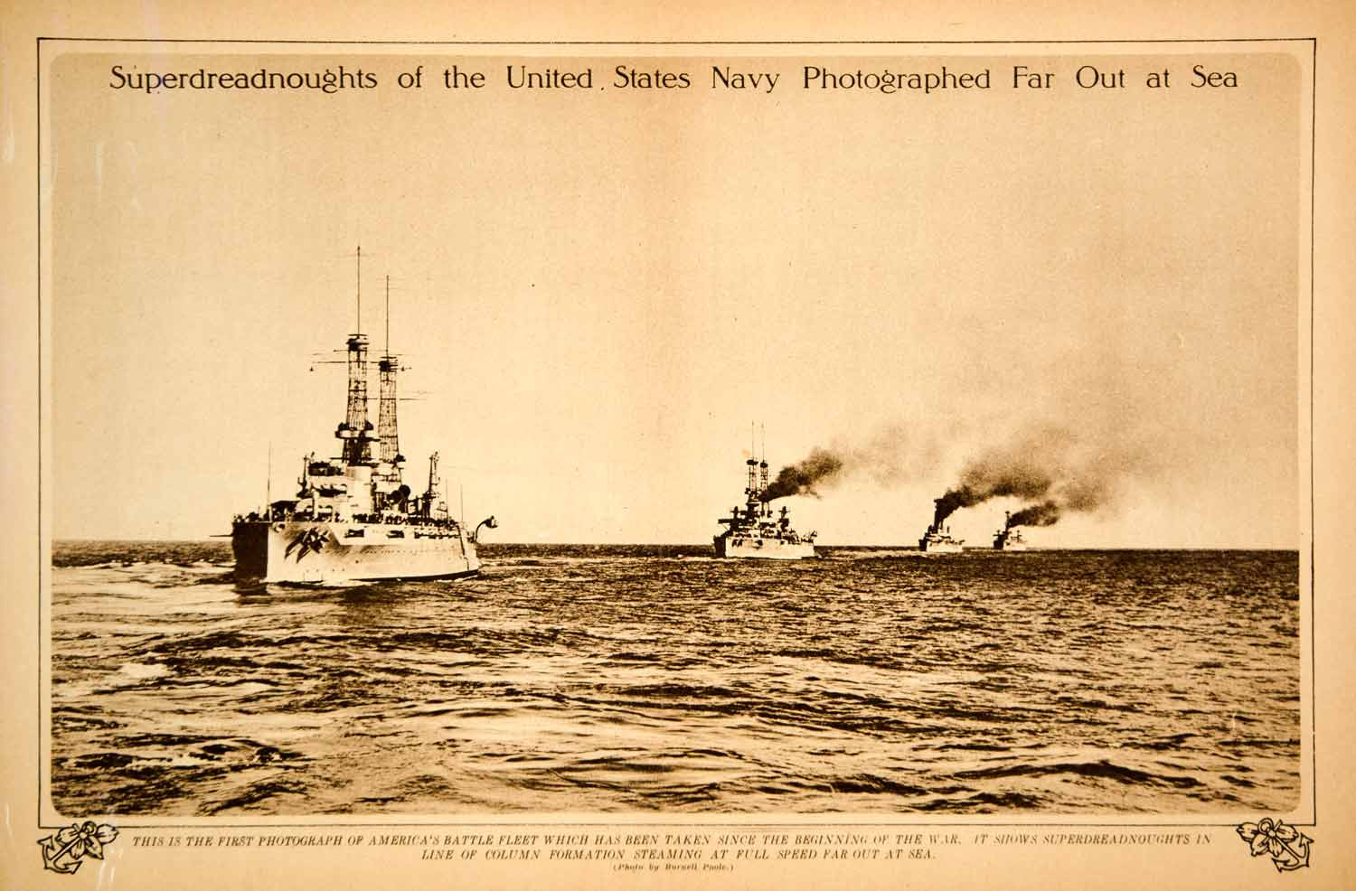 The making of this photograph endangered the life of the photographer. Mr. F. Muller. Jr who specializes in portraits of the beauties in Uncle Sam's navy. Mr. Muller and his companions were in a small power-boat which raced ahead of the New York while the great ship was tearing through the water at twenty-five knots speed. At an opportune time, when the battleship was almost upon them, the small boat was turned at right angles to her course. The engine stopped for a moment of stability, and the picture snapped. Then came a breath-holding period while the engine was being started again, and with a bare margin of a second the small boat scrambled to safety while the giant war machine rushed by, about seventy-five yards away. The New York is the greatest unit in the sea forces of the United States, and until the coming of the British super dreadnought Queen Elizabeth was the greatest in the world. She is 573 feet long, and of 95 feet extreme breadth: her displacement is over 28.000 tons, and her engines of about 30,000 horsepower. The New York's main armament consists of ten 14-inch guns and four submerged 21-inch torpedo tubes. The battleship's guaranteed speed is 21 knots, but her maximum is far above that figure. The New York cost $14.000.000. Image and text provided by Library of Congress, Washington, DC. | Photo from New-York Tribune. (New York [N.Y.]) 1866-1924, 28 March 1915. Image 47, via chroniclingamerica.loc.gov. National Archives Identifier: 55242056. Local Identifier: 111-SC-41465 Photo courtesy of catalog.archives.gov Mid 19 Teens |
