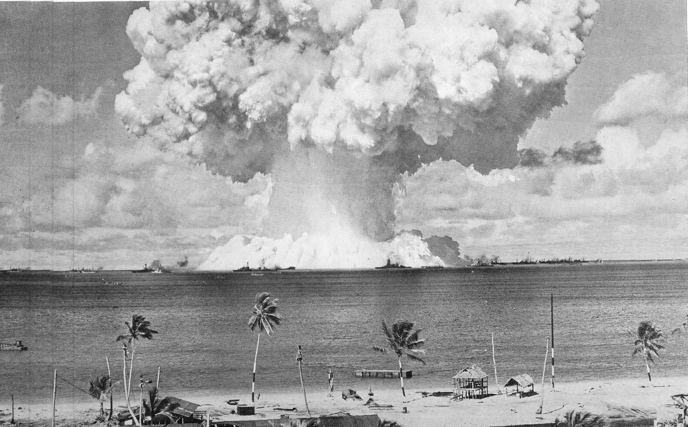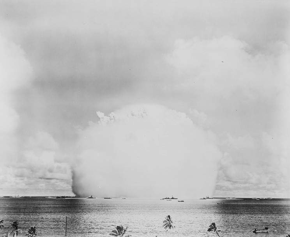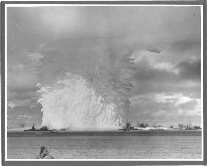 The underwater test at Bikini shows its terric power amid the anchored vessels, made bare seconds after its release. |