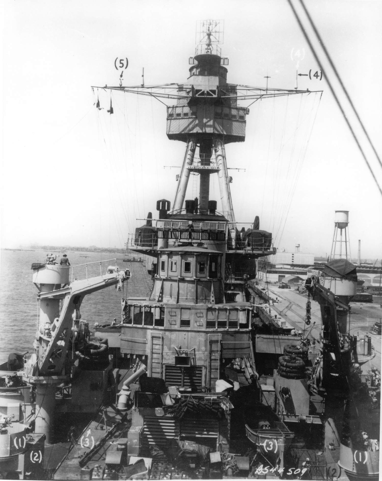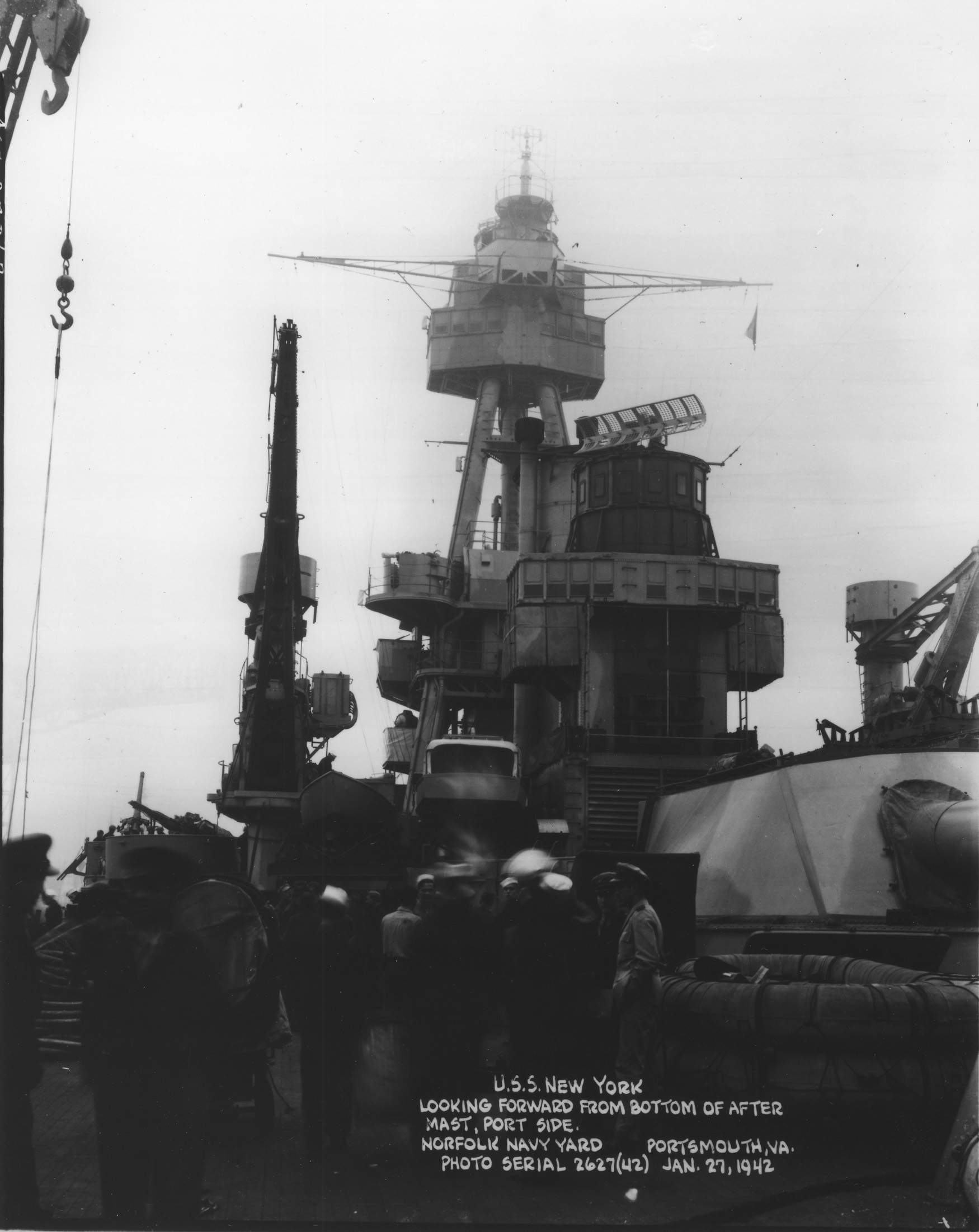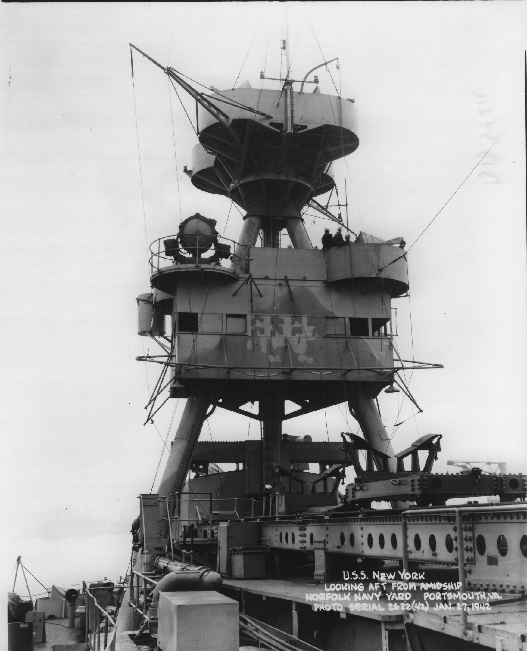 ![]() 236k | New York (BB-34) at the N.Y. Navy Yard in April 1943. The Fire Control and Spotting Station atop the Secondary Battery Control Station aft and below the top of the stack with little smoke interference. It did not have a Battle Lookout Level. | USN photo submitted by Pieter Bakels. |