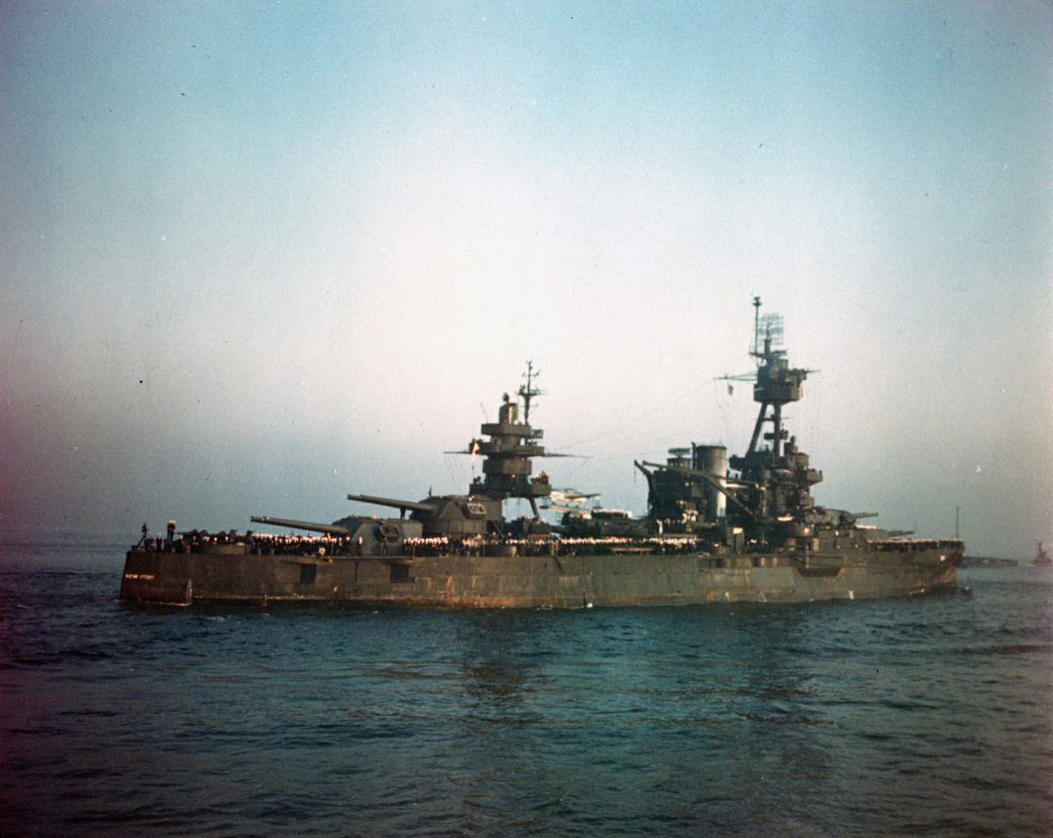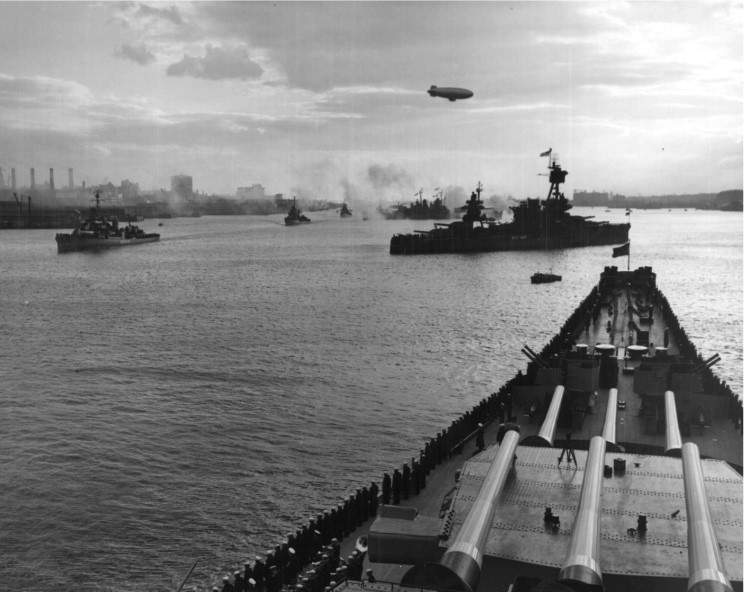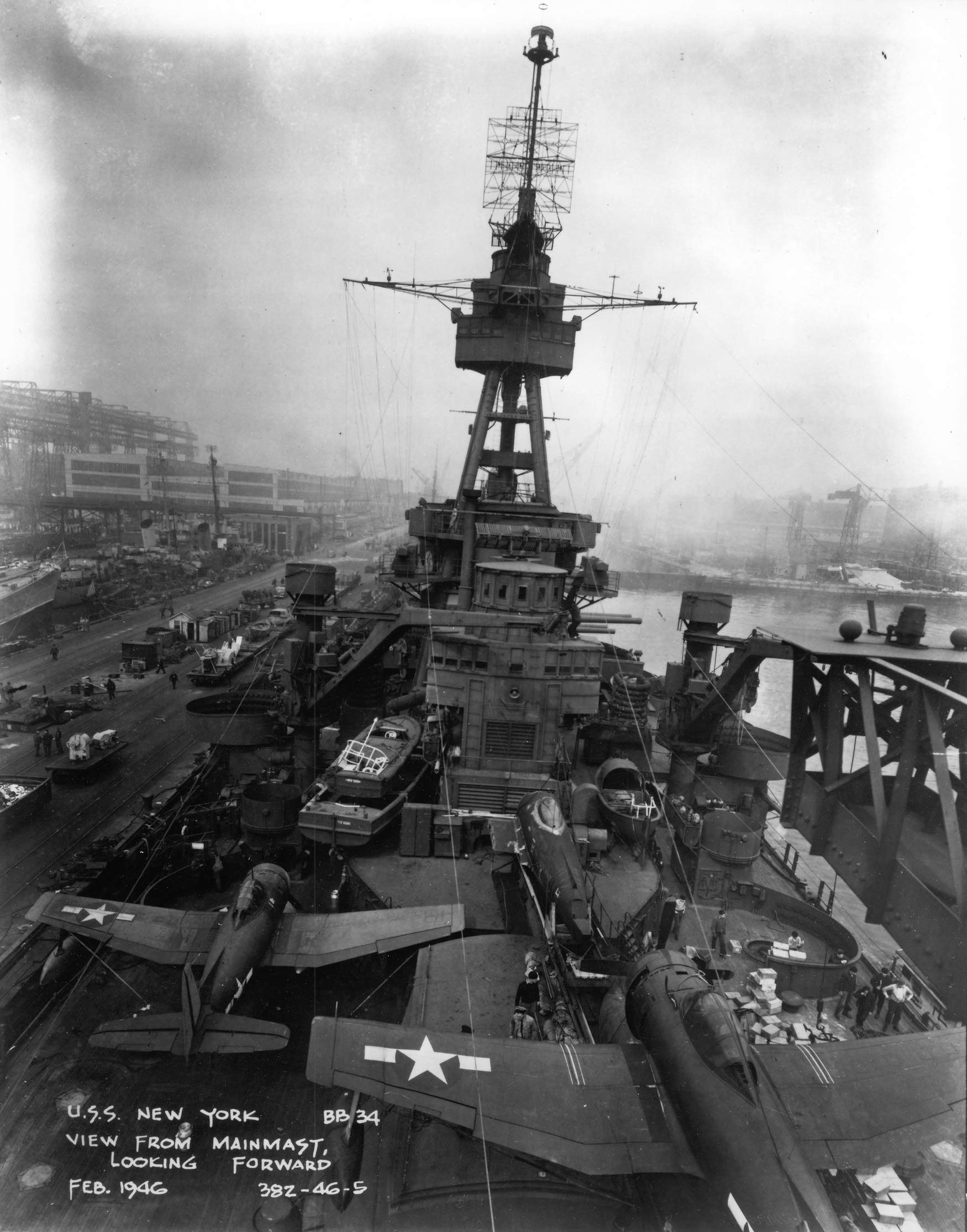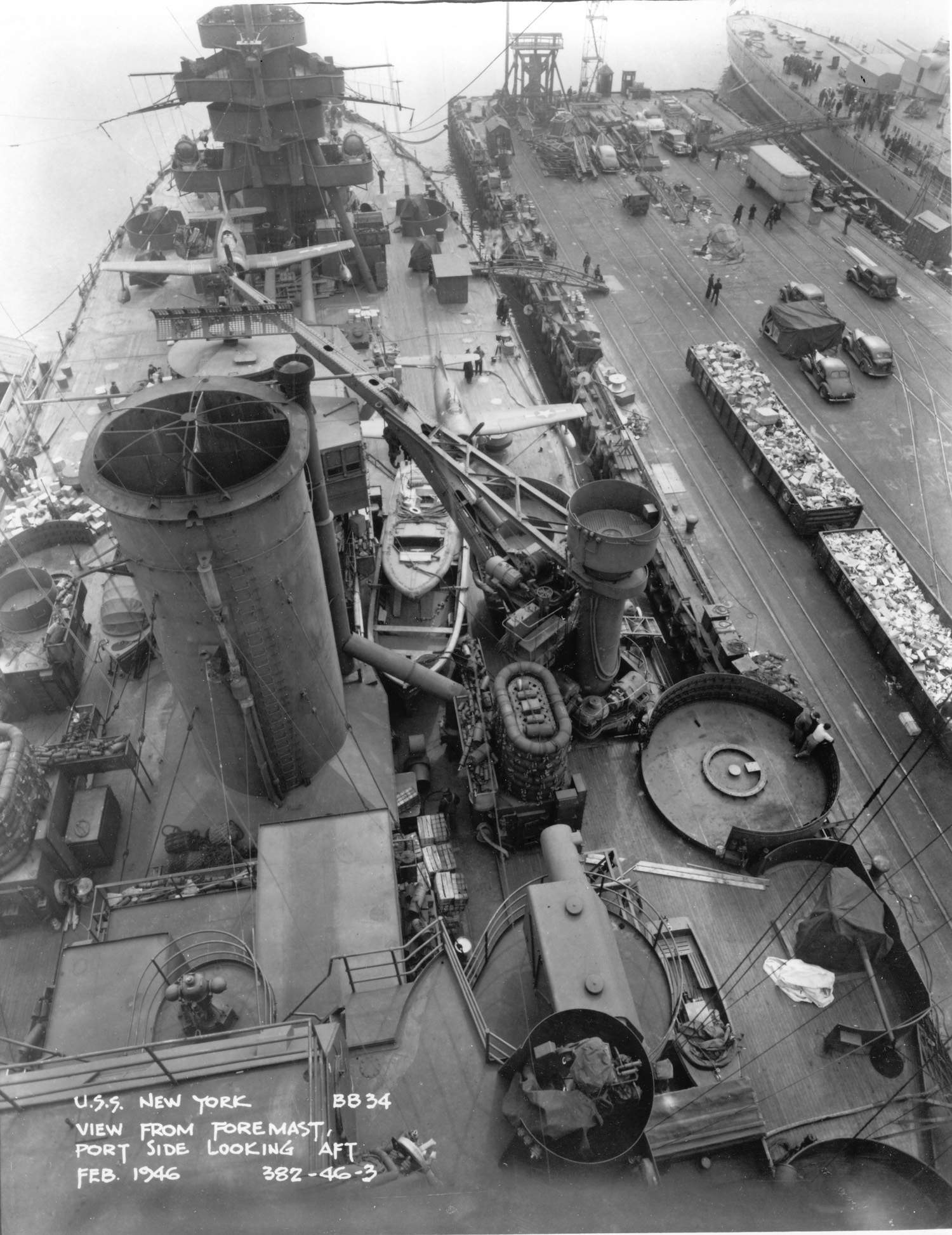 ![]() 148k | New York (BB-34) arrives at New York from the Pacific, circa 19 October 1945. She was featured in Navy Day celebrations there later in the month. | Credit: National Archives via Yu Chu. |
