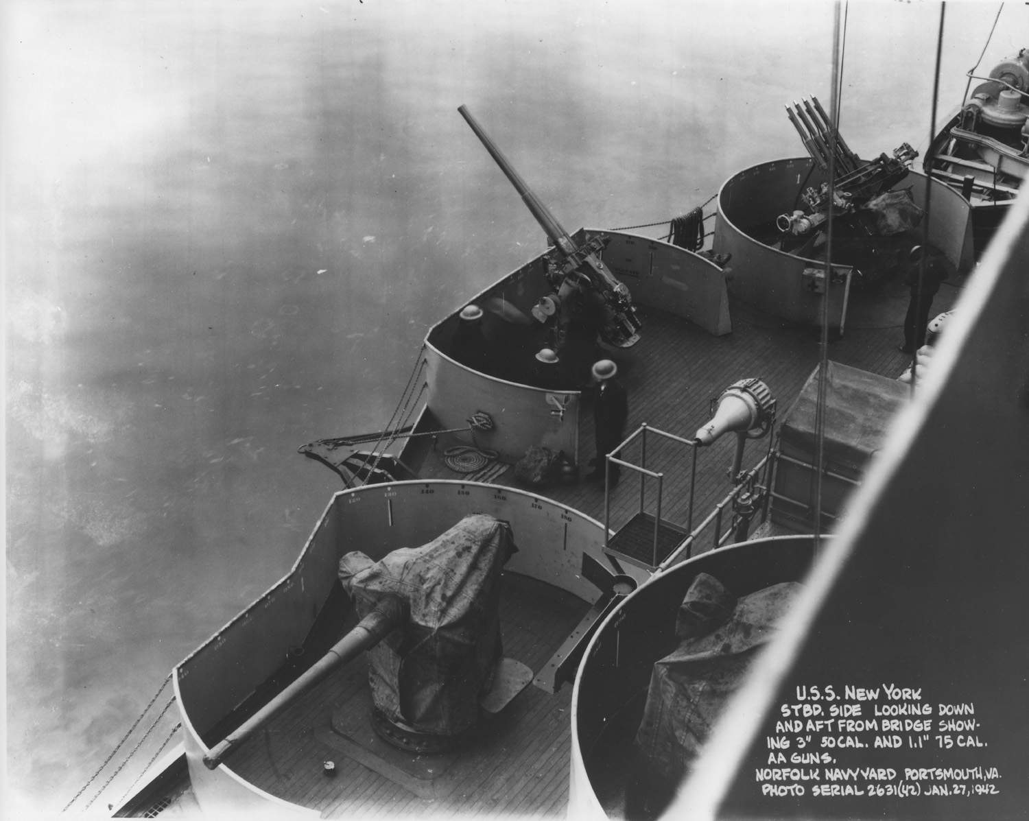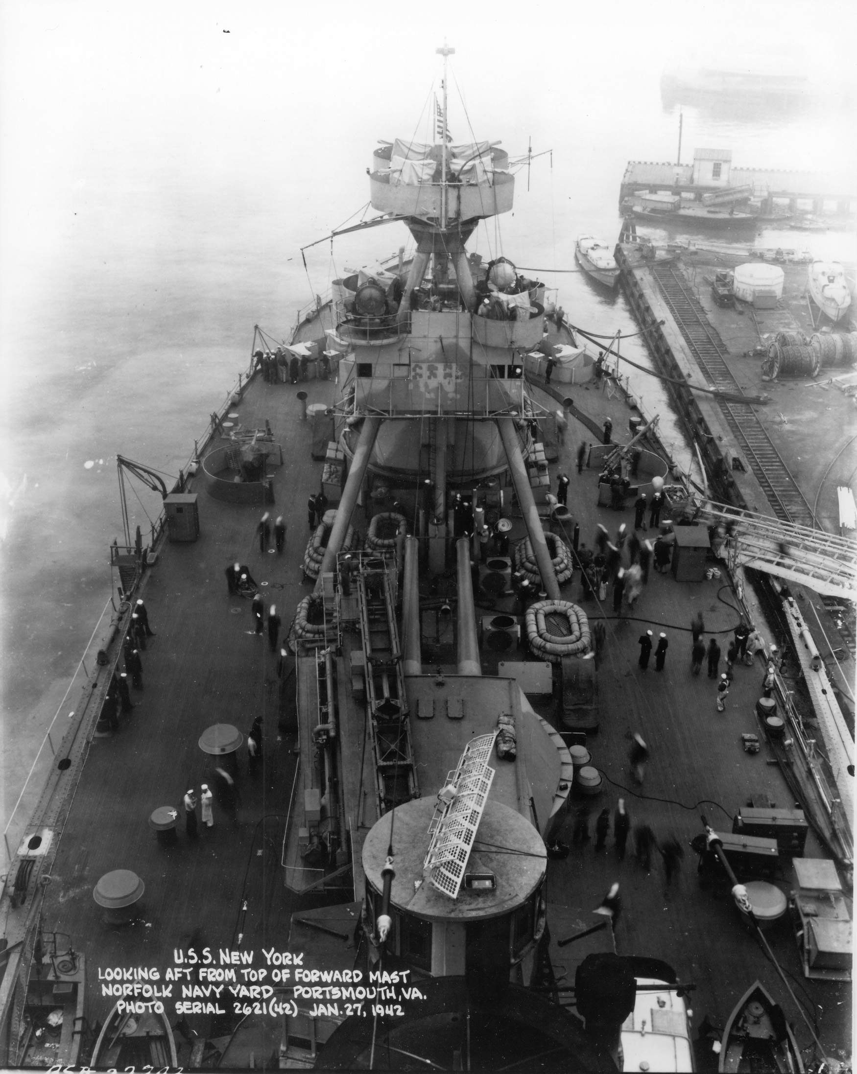 | ![]() 331k | Aerial oblique view of New York (BB-34) at sea, February, 1942. |