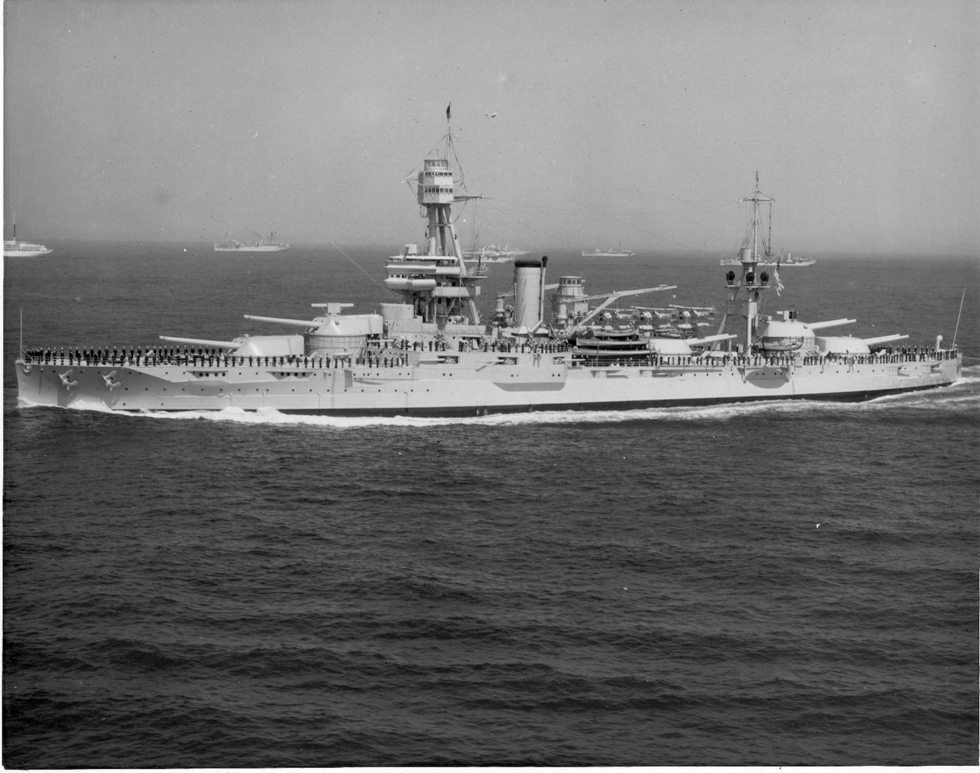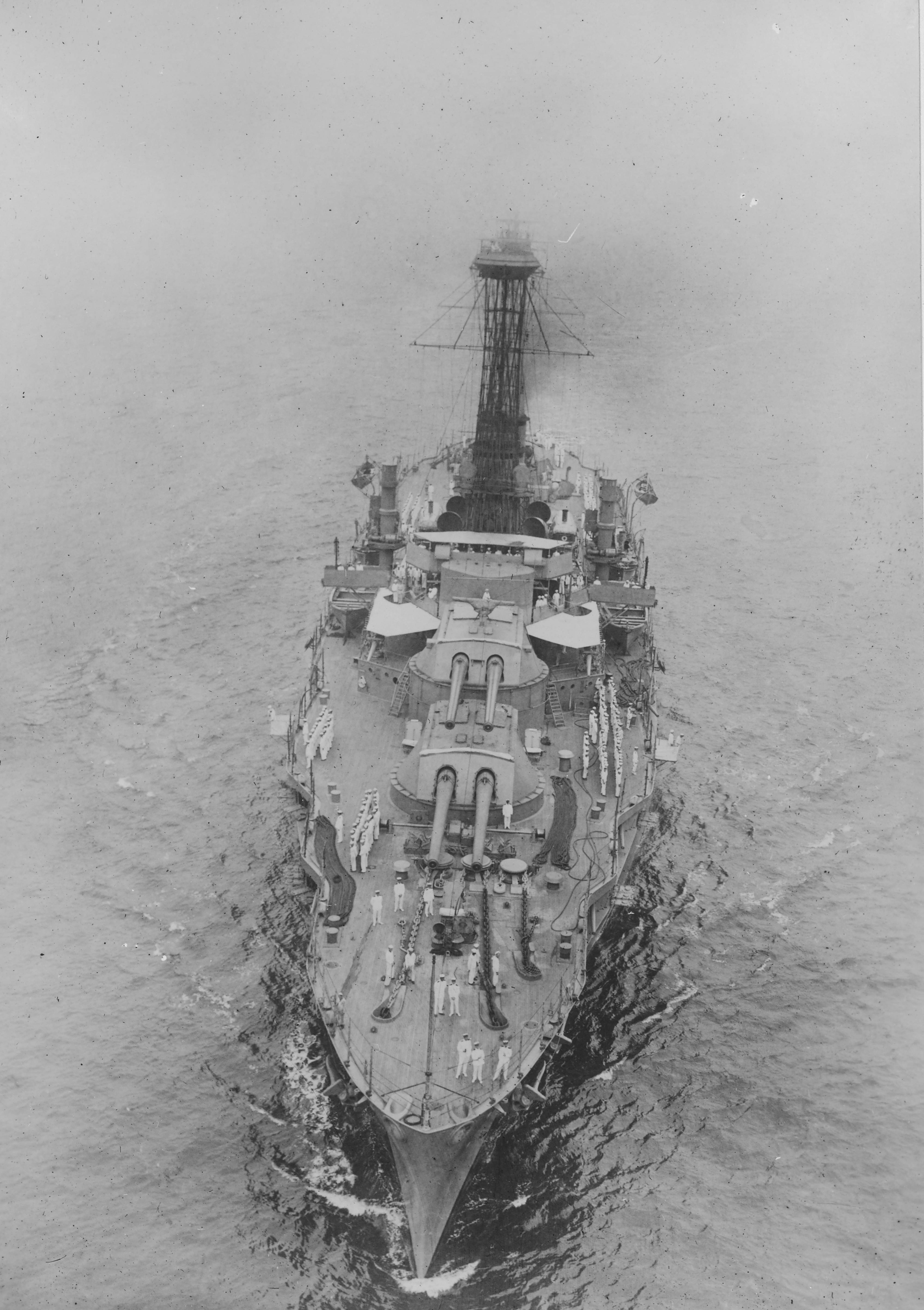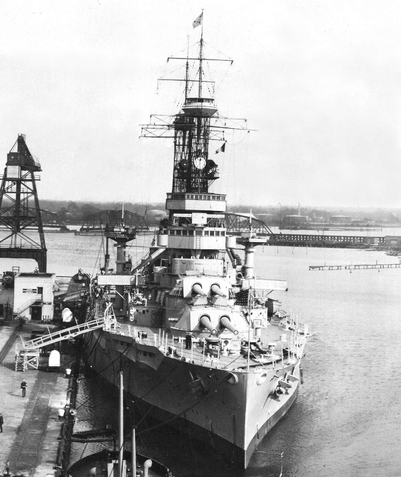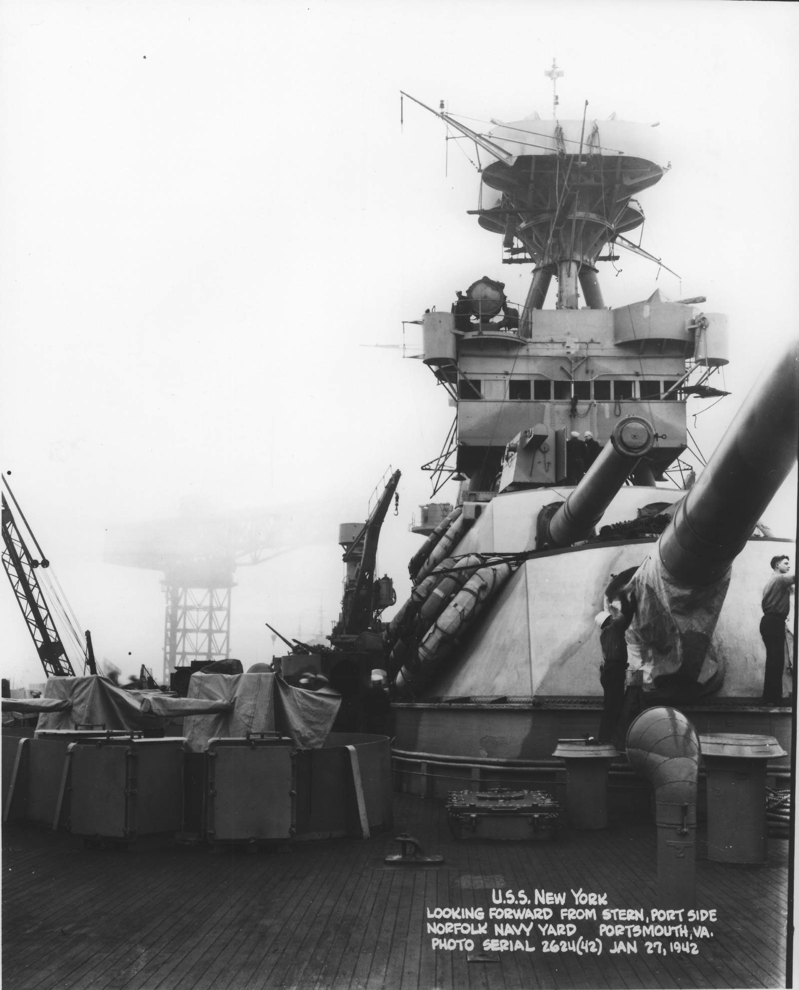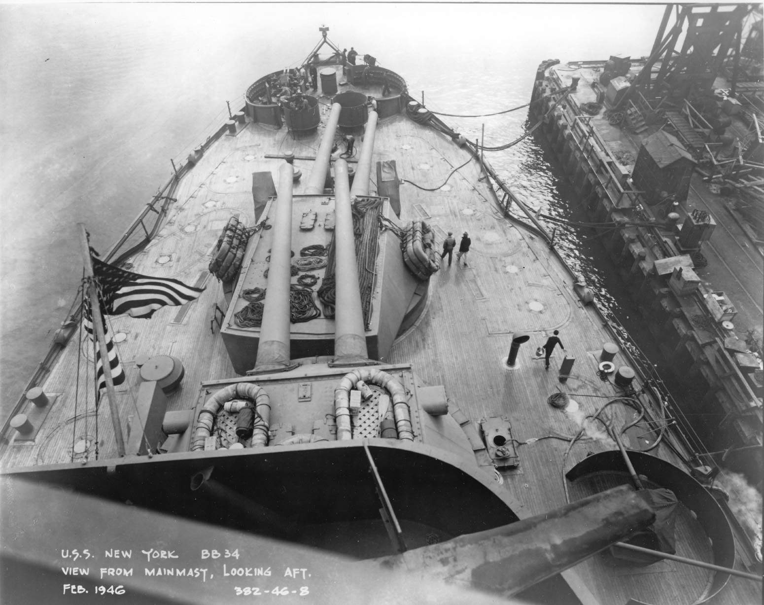 Photo courtesy of catalog.archives.gov ![]() 145k | View of the New York (BB-34) showing her propeller-less stems from her stern. | Digital ID:# ggbain 10835, LC-B2-2445-12, / 2387991140_5a3f6ff6d7_o. Source: Library of Congress Prints and Photographs Division, from the George Grantham Bain Collection, courtesy of Tom Kermen. |