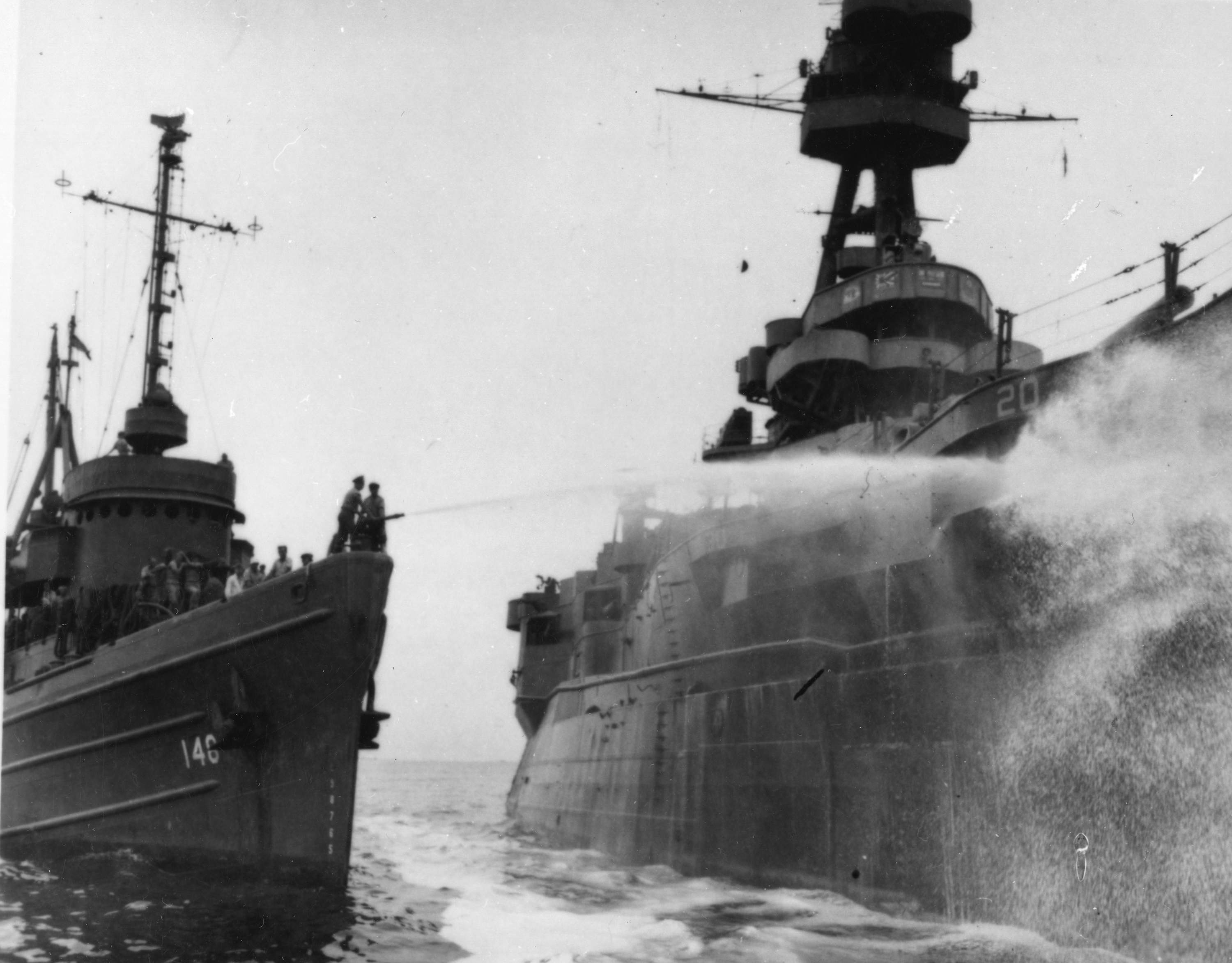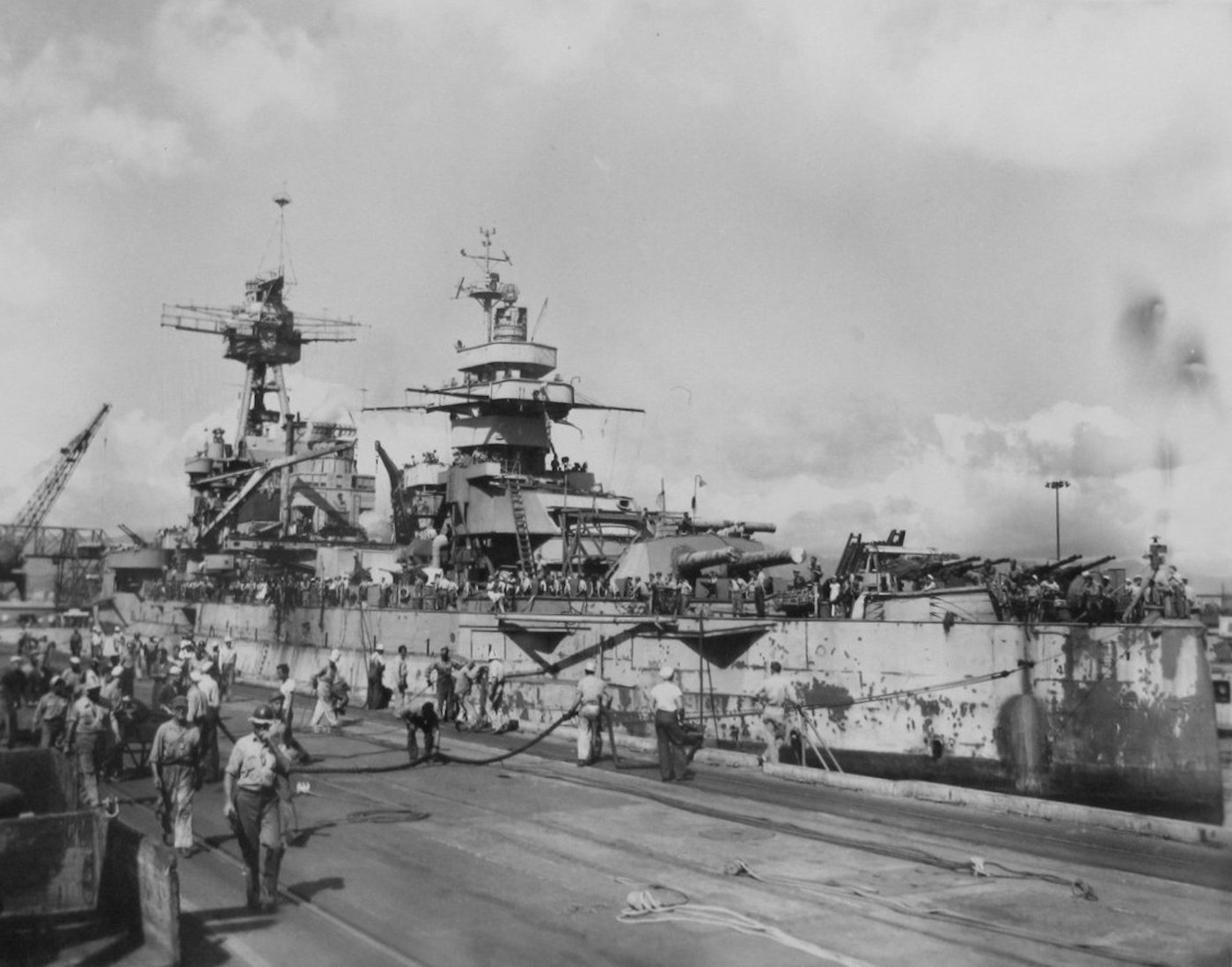 | Photographer: Elliot Elisofon, courtesy of life.com. | ![]() 489k | Ex- New York (BB-34) and Ex-Nevada (BB-36) anchored at Pearl Harbor on 8 June 1948. Both had served as targets in the Bikini atomic bomb tests two years previously, and will be sunk in ordnance tests a few weeks after the photo was taken.