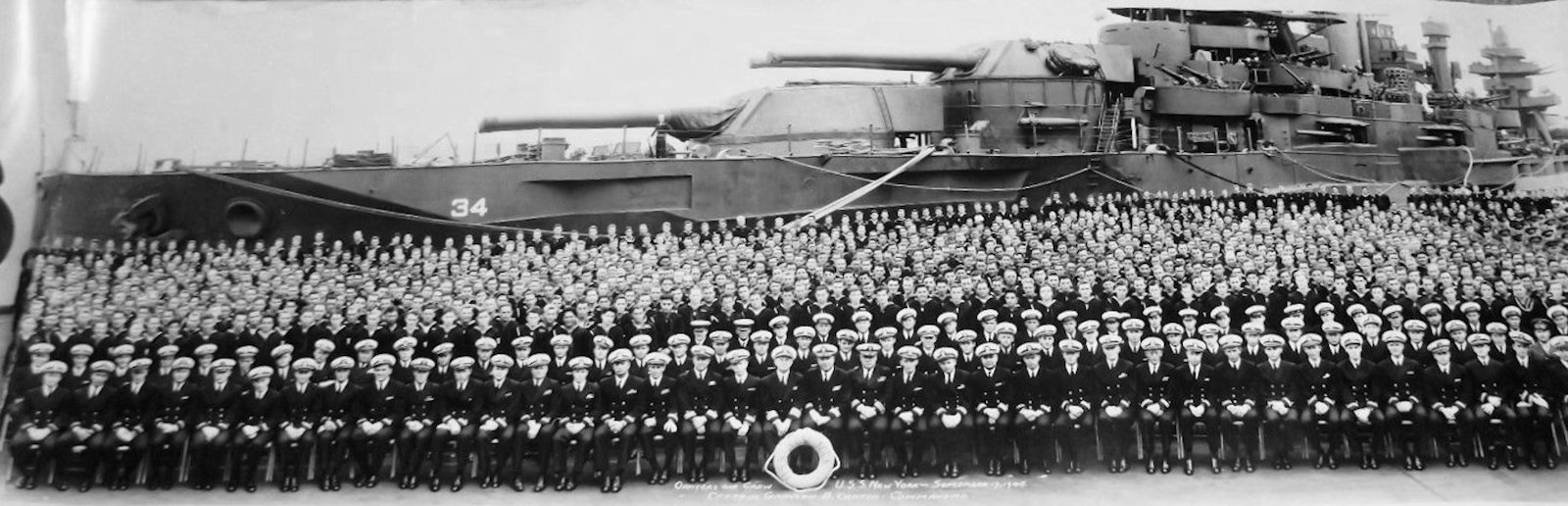 USN photo # 80-G-0837 from NARA, College Park, Maryland, courtesy of Sean Hert. ![]() 217k | New York (BB-34) & crew pose for end of war photo, September 1945. | USN photo courtesy of David Buell.