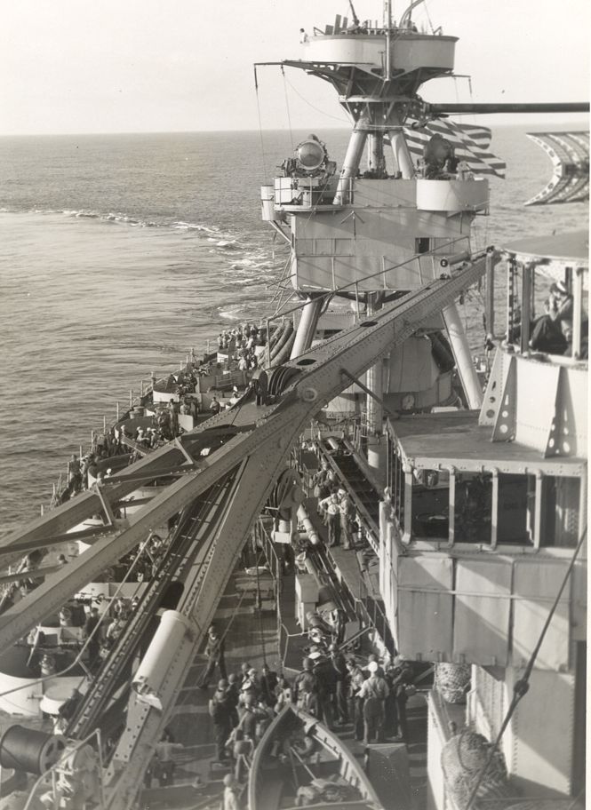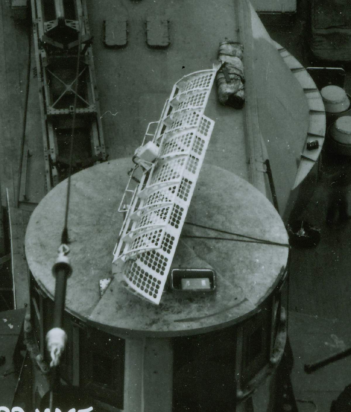 ![]() 267k | View from foremast, Stb.side, looking aft. February, 1946. | USN photo submitted by Pieter Bakels. Photo Serial # 382-46-4. |