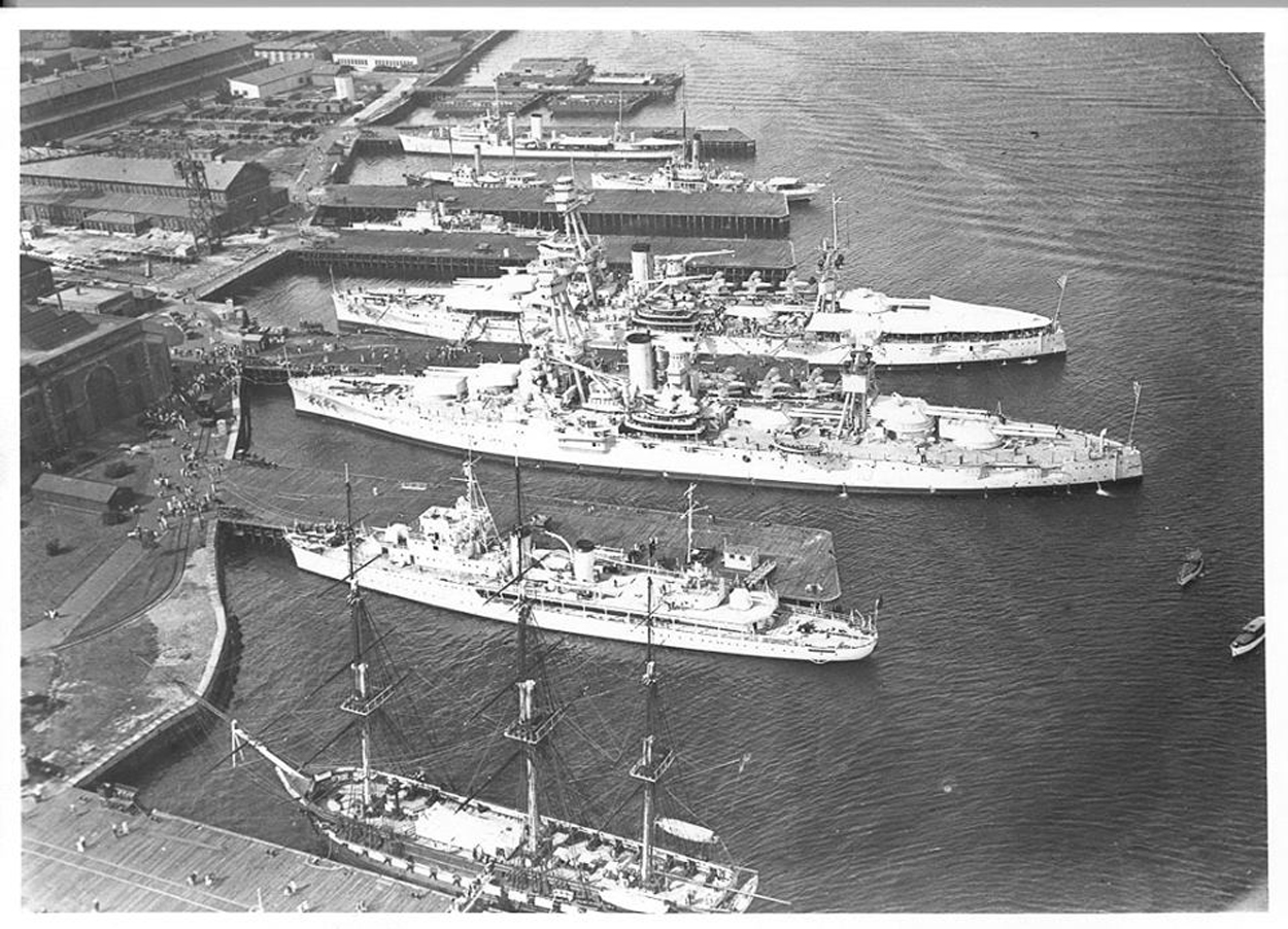 Photo courtesy of catalog.archives.gov ![]() 1.84k | Vessels Alongside Pier D Looking Southwest from Pier E, 18 December 1913. | New York (BB-34) fitting out with Arkansas (BB-33) behind. One of the Delaware's (BB-28/29) is beyond them. Photo i.d. & text courtesy of Richard Jensen. |